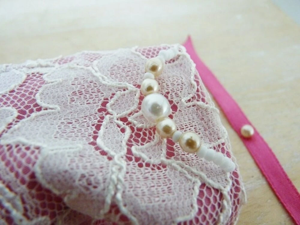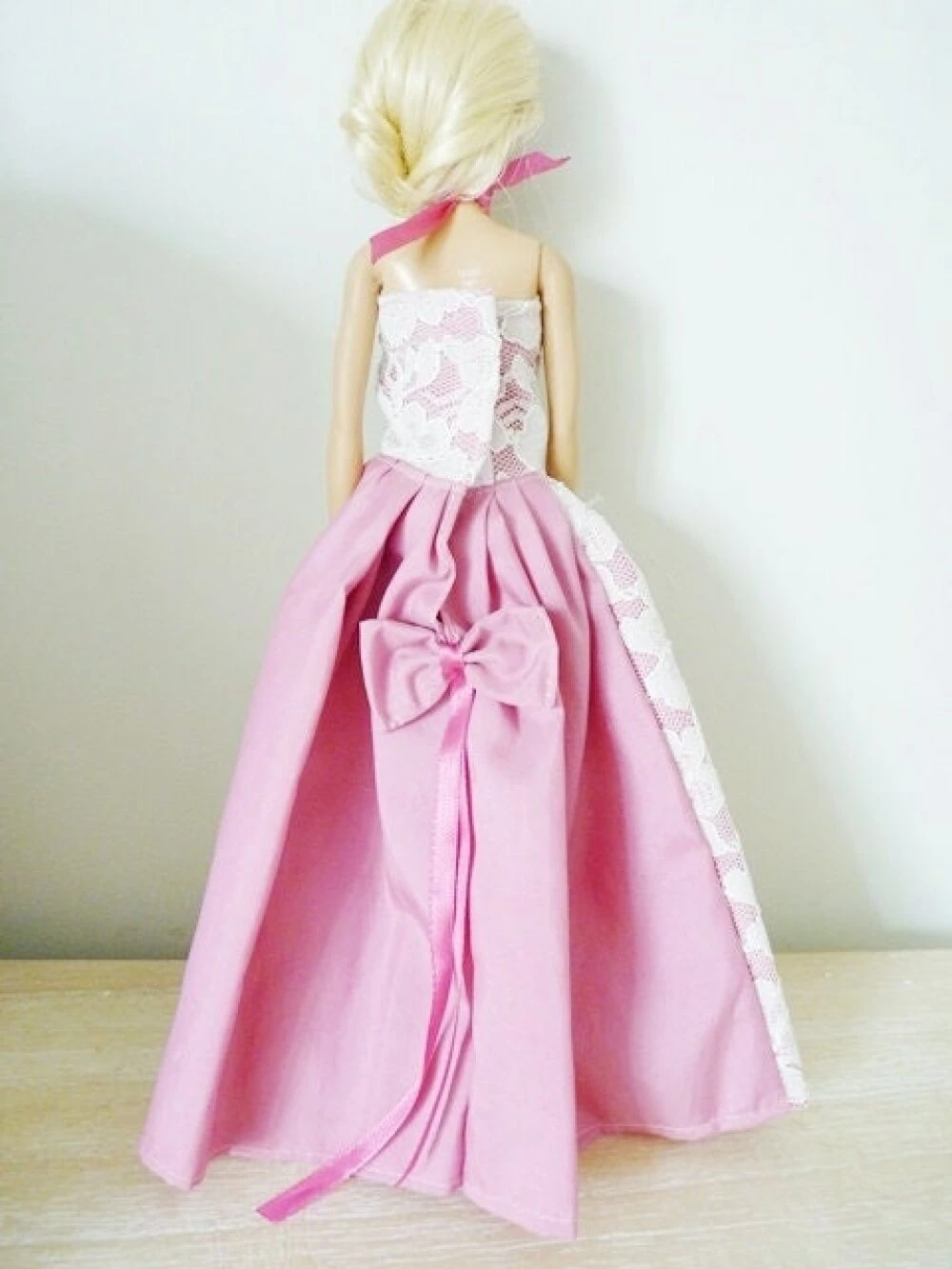 Dentelle sur le bustier et le devant de la robe, nœud en tissu rose et ruban de satin dans le dos de la robe.