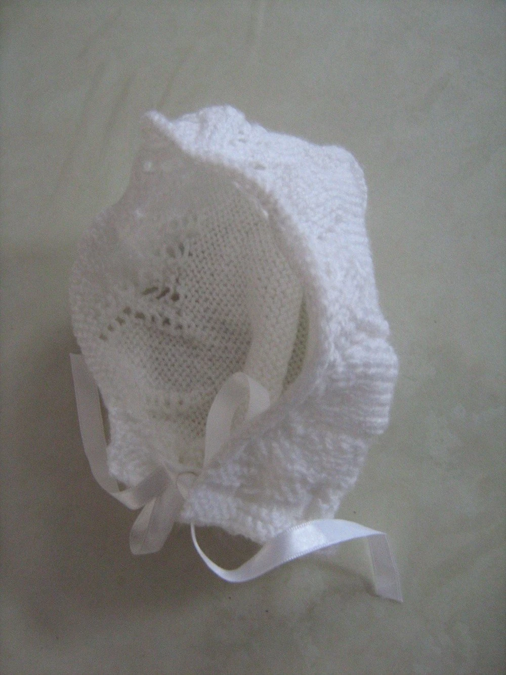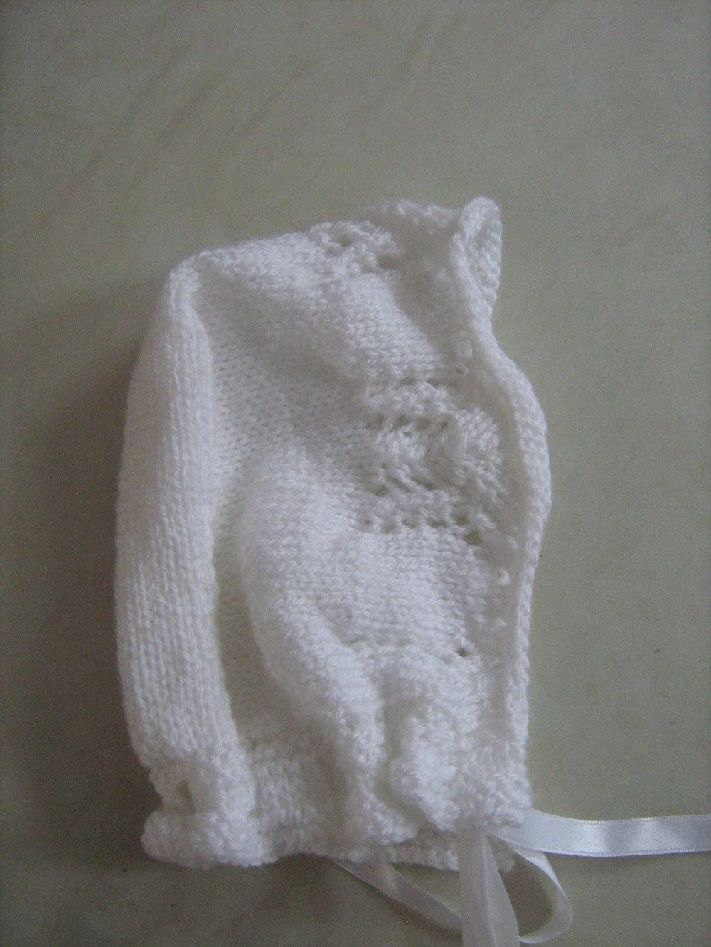 Robe de baptême pour bébé, taille 3/6 mois, couleur blanc. La robe est tricotée en jersey, avec des lignes de jours, et un point fantaisie au bas de la jupe et des manches. Ouverture au dos avec 3 petits boutons. Ruban à la taille, au col et au bas des manches.