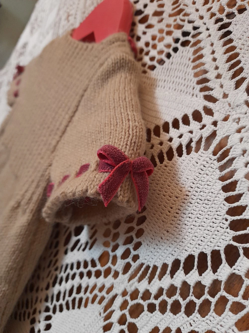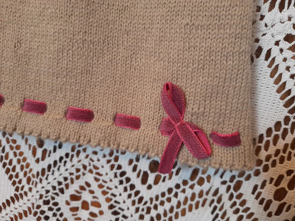 Originale par son plastron tricoté en côte, ses bas de manches et son jupon ornés d’un ruban de velours couleur bois de rose et 2 boutons assortis pour la fermer au niveau des épaules.