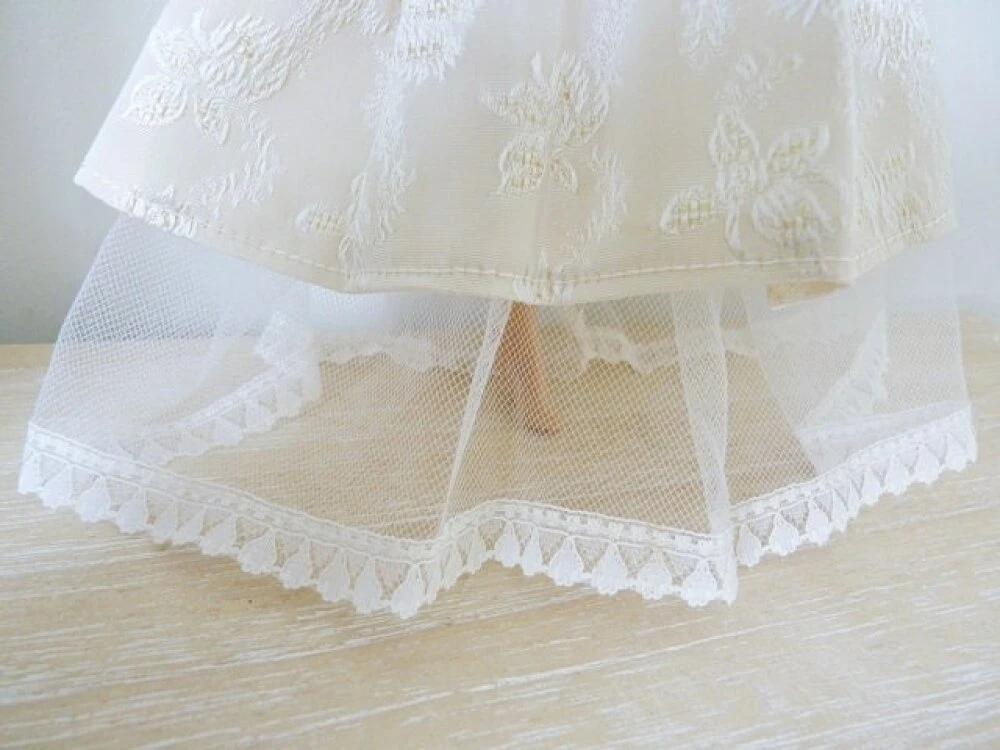 Le bas de la robe est doublé de tulle bordé de dentelle blanche. On retrouve cette dentelle sur le haut du bustier.