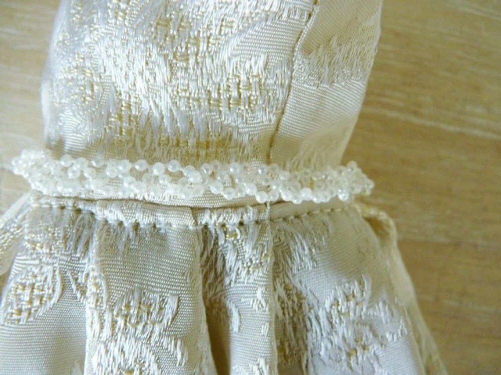 Une ceinture en natte de perles décore la robe, ainsi qu’une breloque de perles sur le corsage.