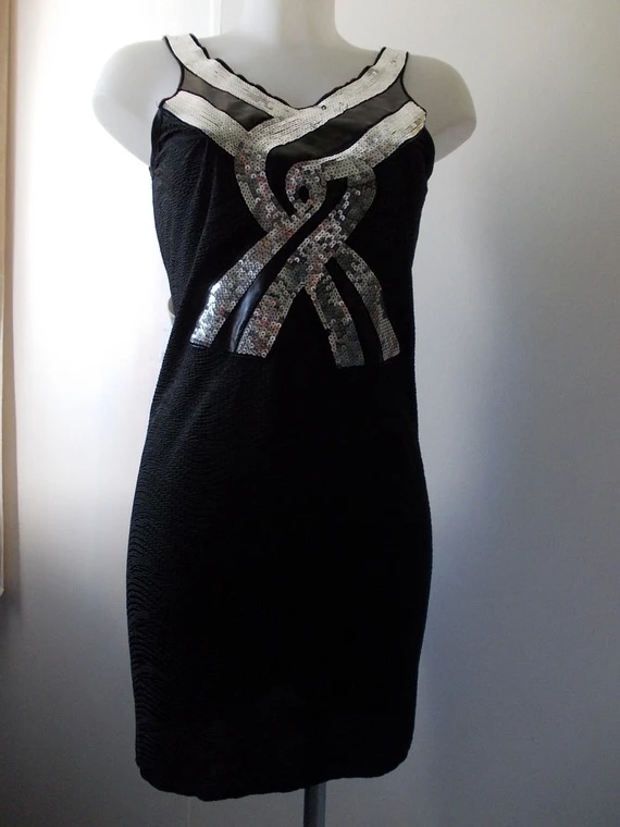 Robe de soirée mi longue en jersey noir,encolure en v,avec un plastron argenté,sans manches.
