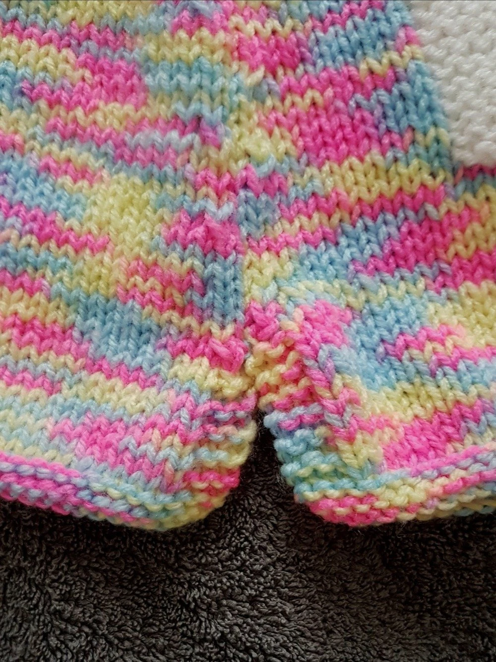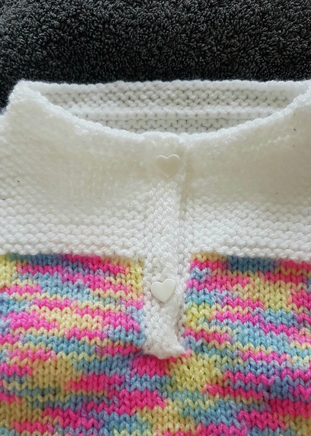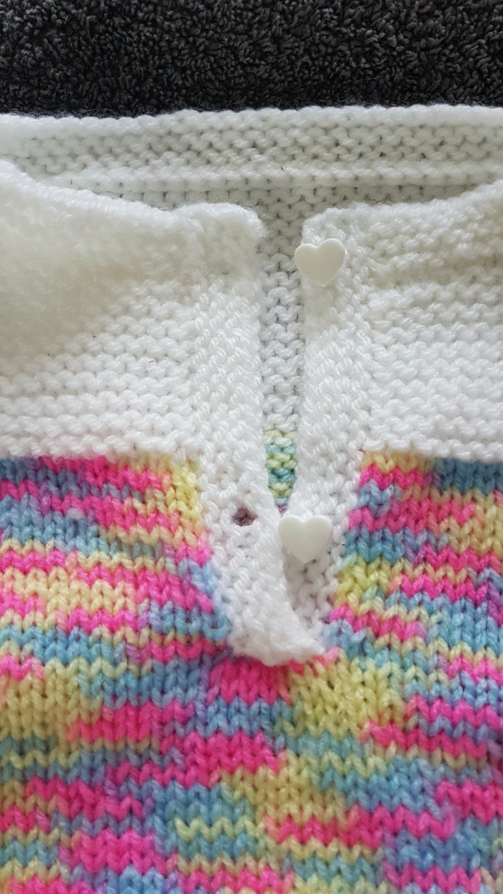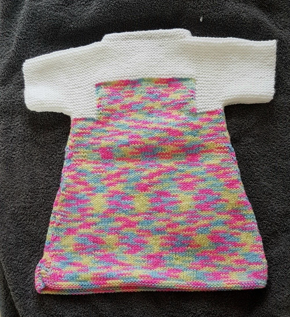 Robe chasuble demi manche de couleur blanc et multicolore pour une petite fille de 12 mois tricoter a la main au point de jersey et point de mousse …C’est une laine très douce et chaude …Deux jolies boutons blanc en forme de cœur pour l’encolure …Cette jolie robe s’enfile pas la tête… Deux petites fentes sur le coté de la robe réaliser au point de mousse. .