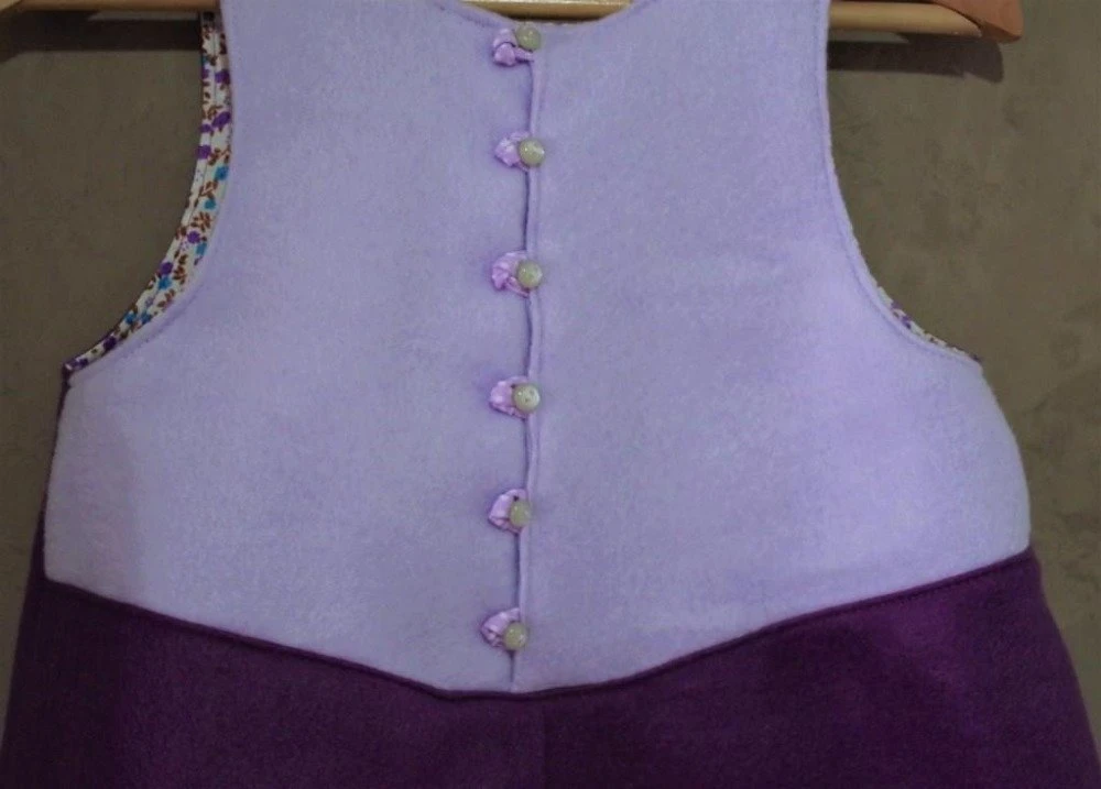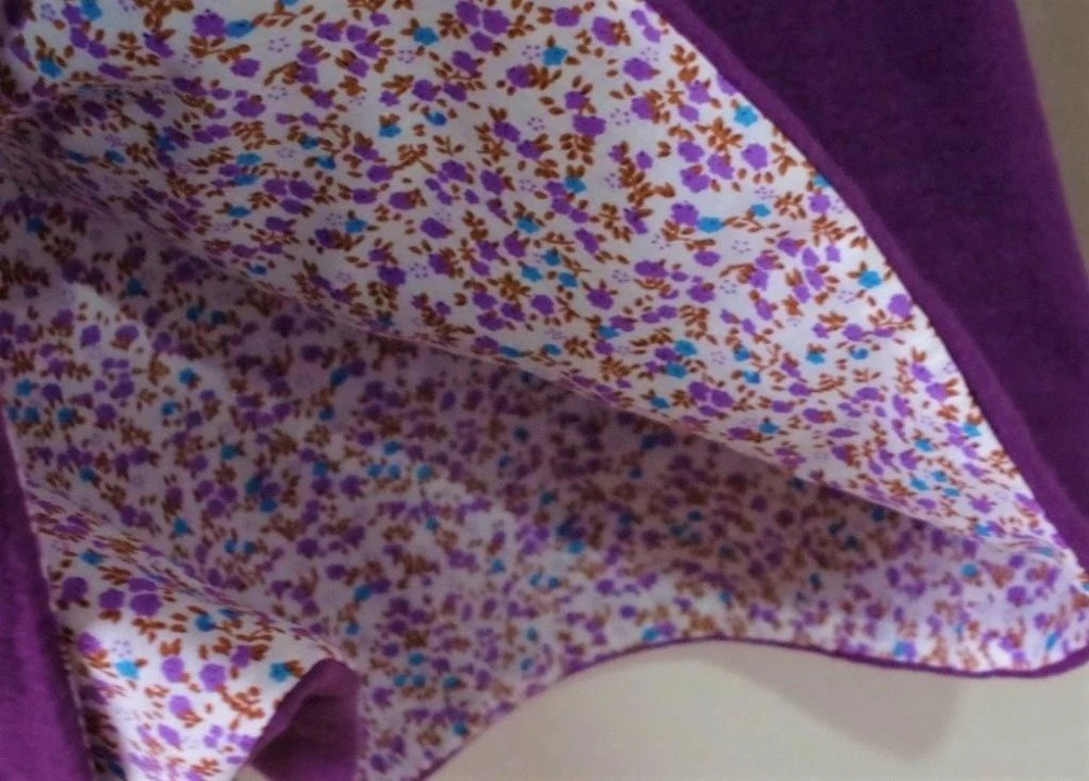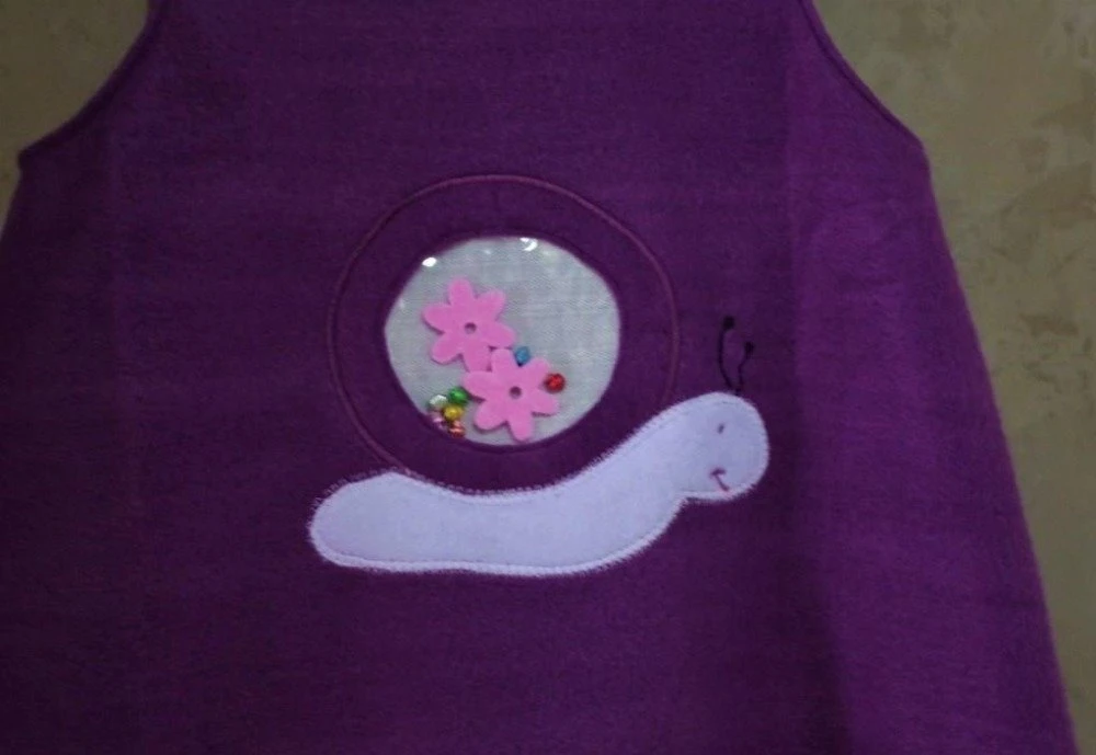 Elle est réalisée avec des tissus polaires violet et parme, et elle est doublée d’un coton fleuri.Elle est agrémentée d’une applique escargot garni à l’avant.
