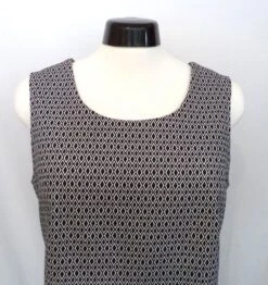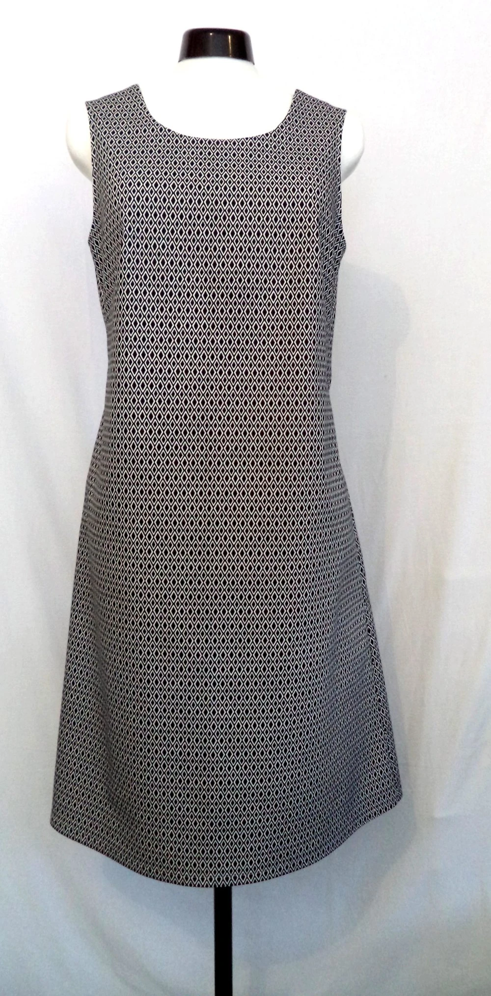 Robe de forme droite, légèrement évasée, semi-ajustée, réalisée en coton extensible, à motifs géométriques noirs et blancs.