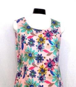 Robe de forme droite, légèrement évasée, semi-ajustée, réalisée en coton extensible, à fleurs.