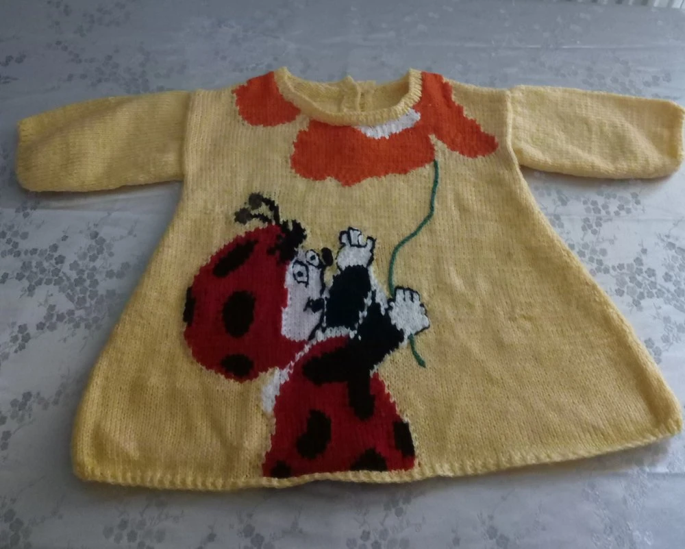Elle est en jacquard sur fond jaune. J’ai dessiné sur le devant de la robe une coccinelle avec une fleur qui auréole le col. La tête de la fille représente le centre de la fleur.