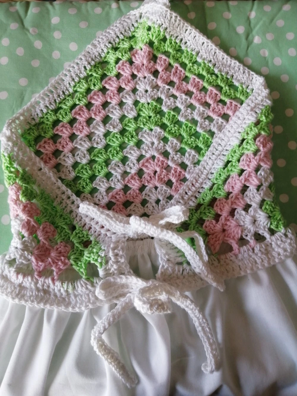 Robe enfant dos nu au crochet,Bohême, hippie tons vert amande et rose,blanc