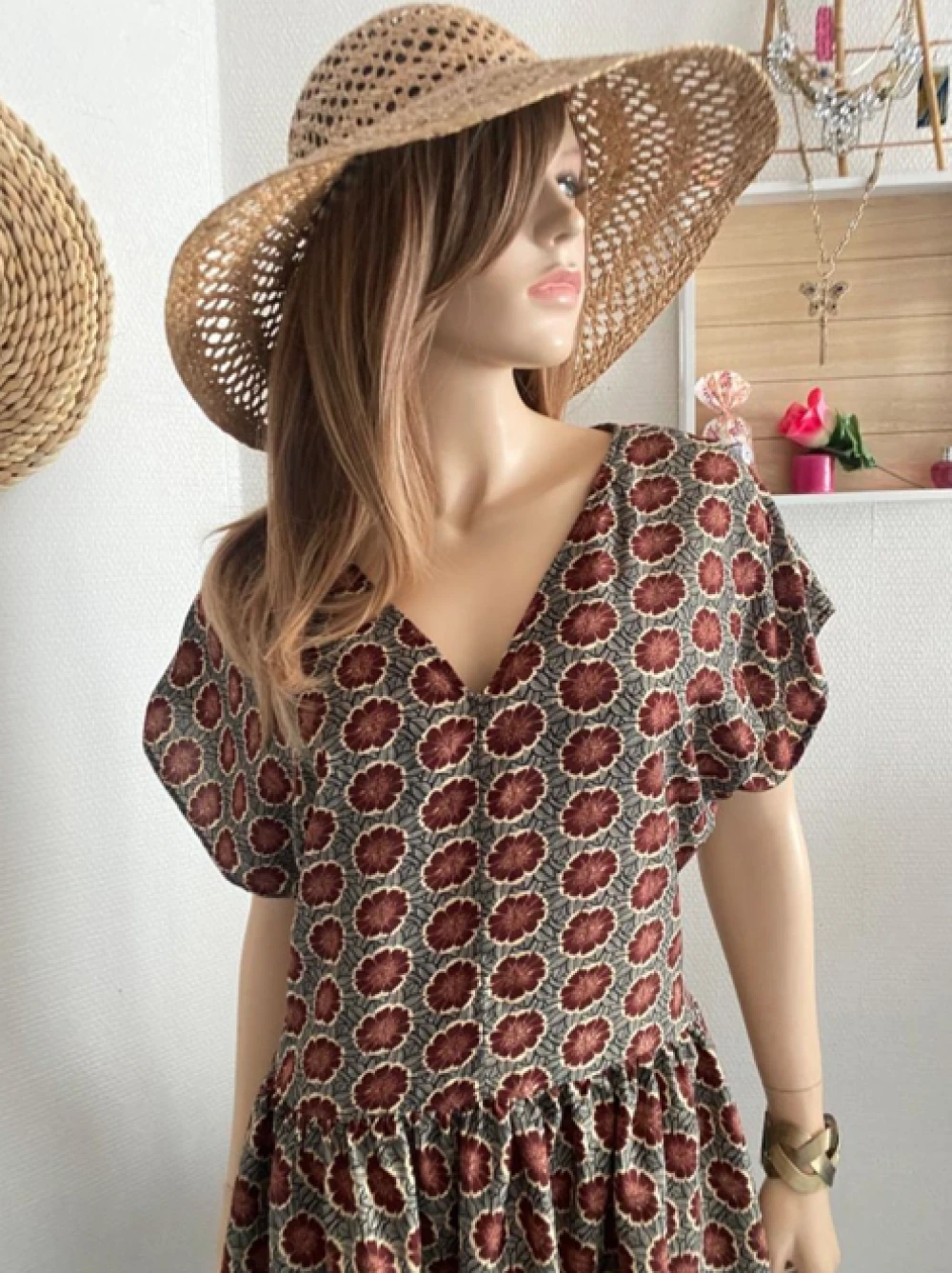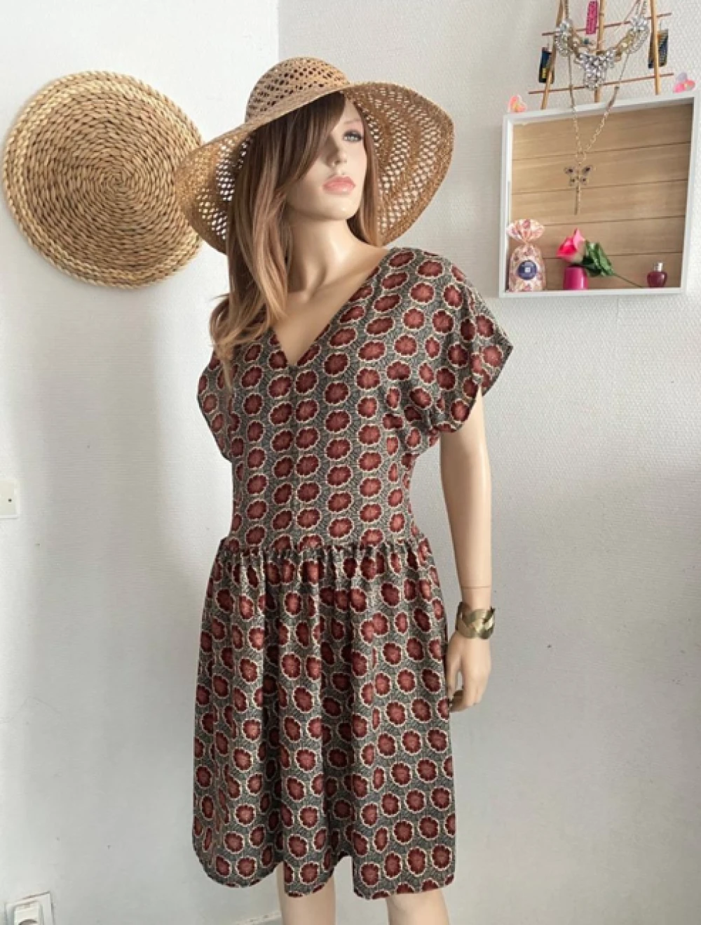 Robe manches courtes et larges. Décolleté en V, robe évasée.