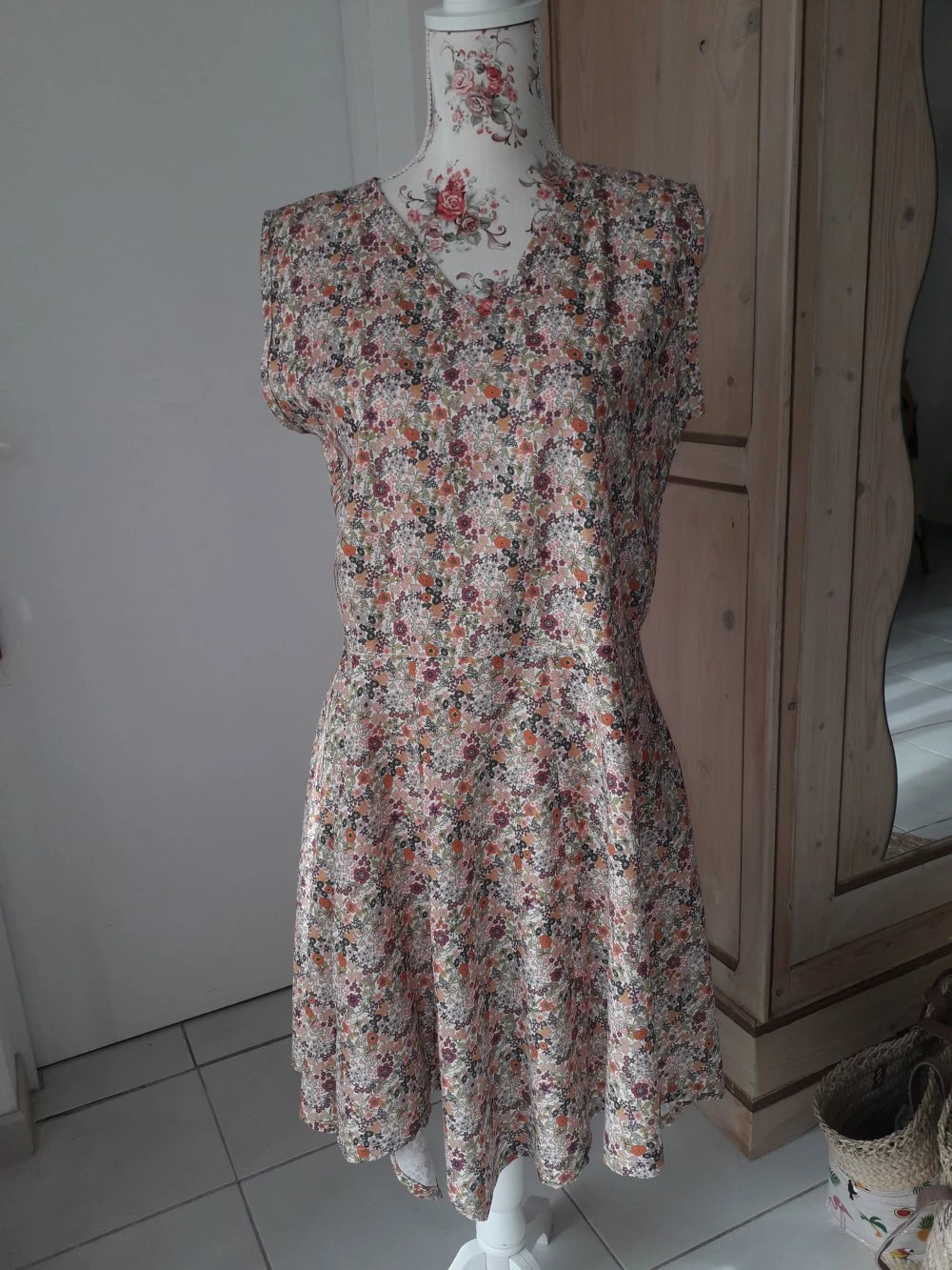 En coton EKO, imprimé fleur rose pastel, taille sans élastique, bas de robe déstructuré.