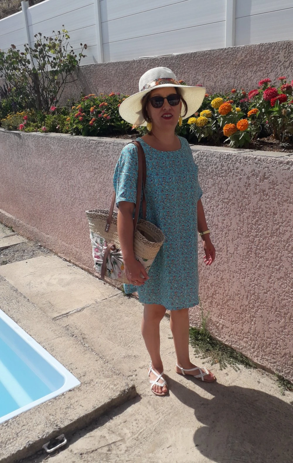 En coton EKO, imprimé fleurs sur fond turquoise.