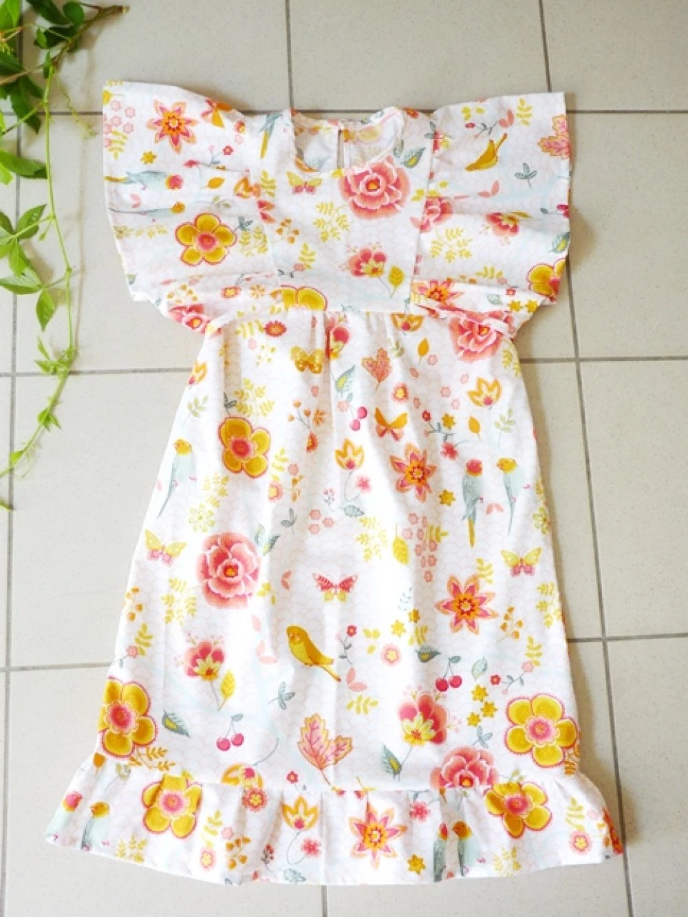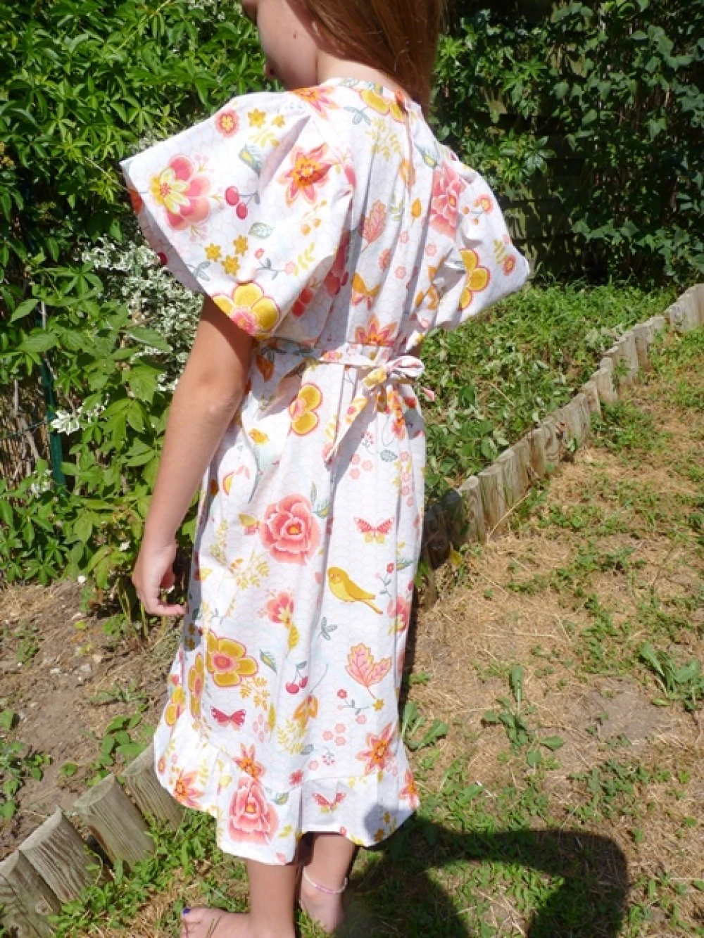 Manches papillons plissées et bas de la robe volanté, fermeture dans le dos avec un bouton, taille soulignée par un lien à nouer dans le dos.