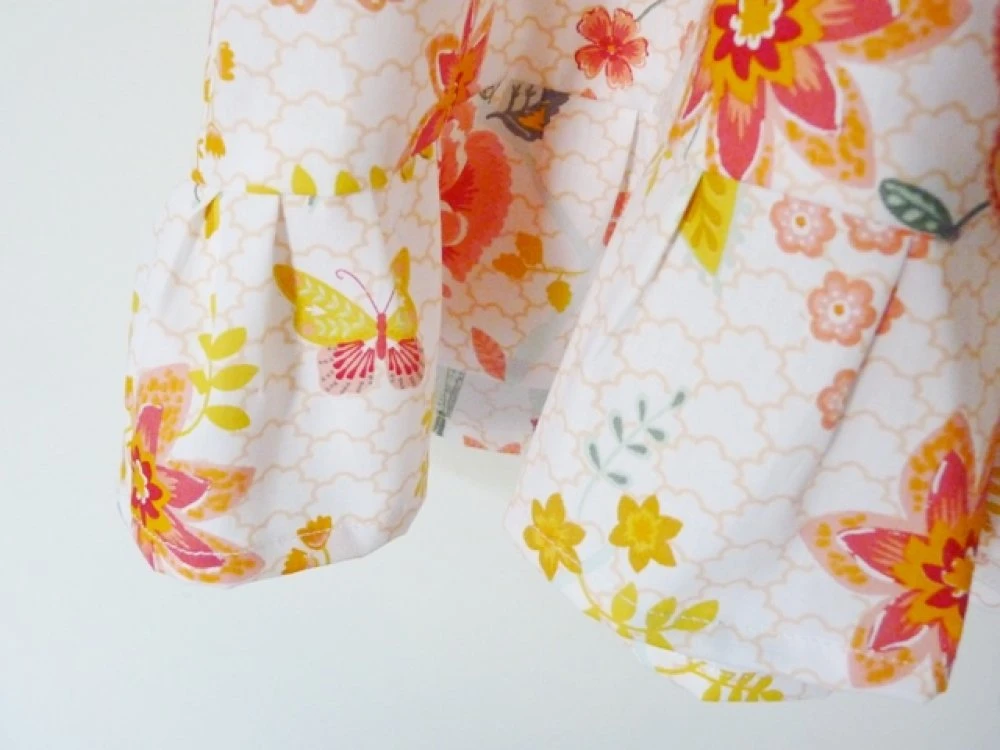 Belle robe romantique taille 8 ans en tissu de coton motifs floraux avec des oiseaux et des papillons dans des teintes orangées sur fond blanc.