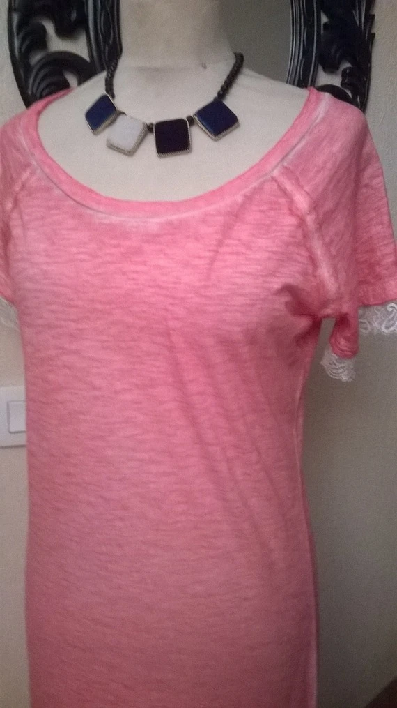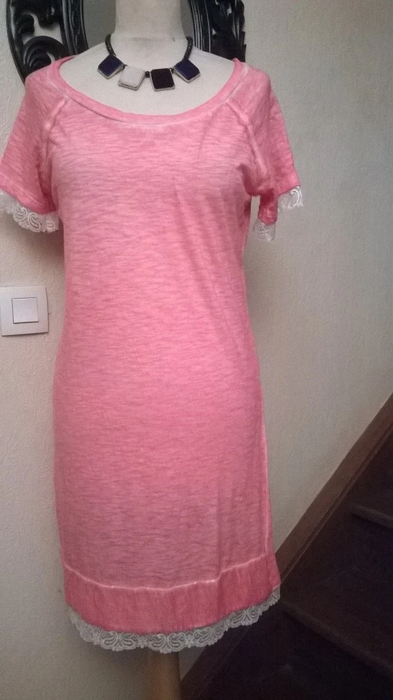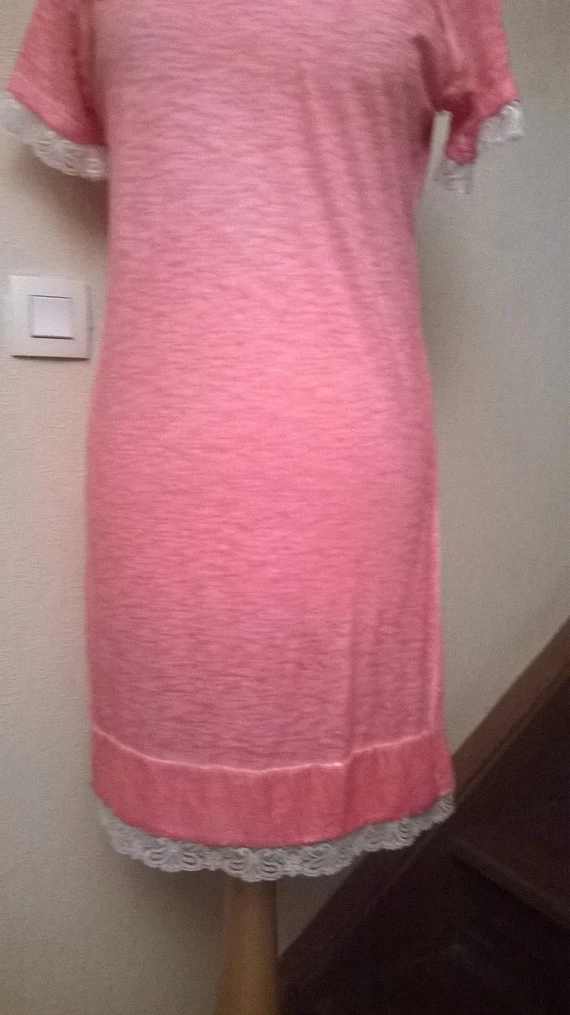 col rond et manches courtes avec un galon fin de mousseline rose et des petites paillettes rose