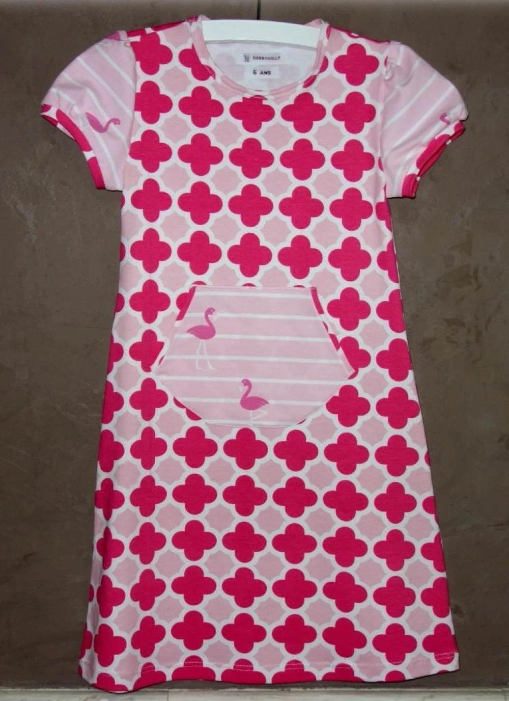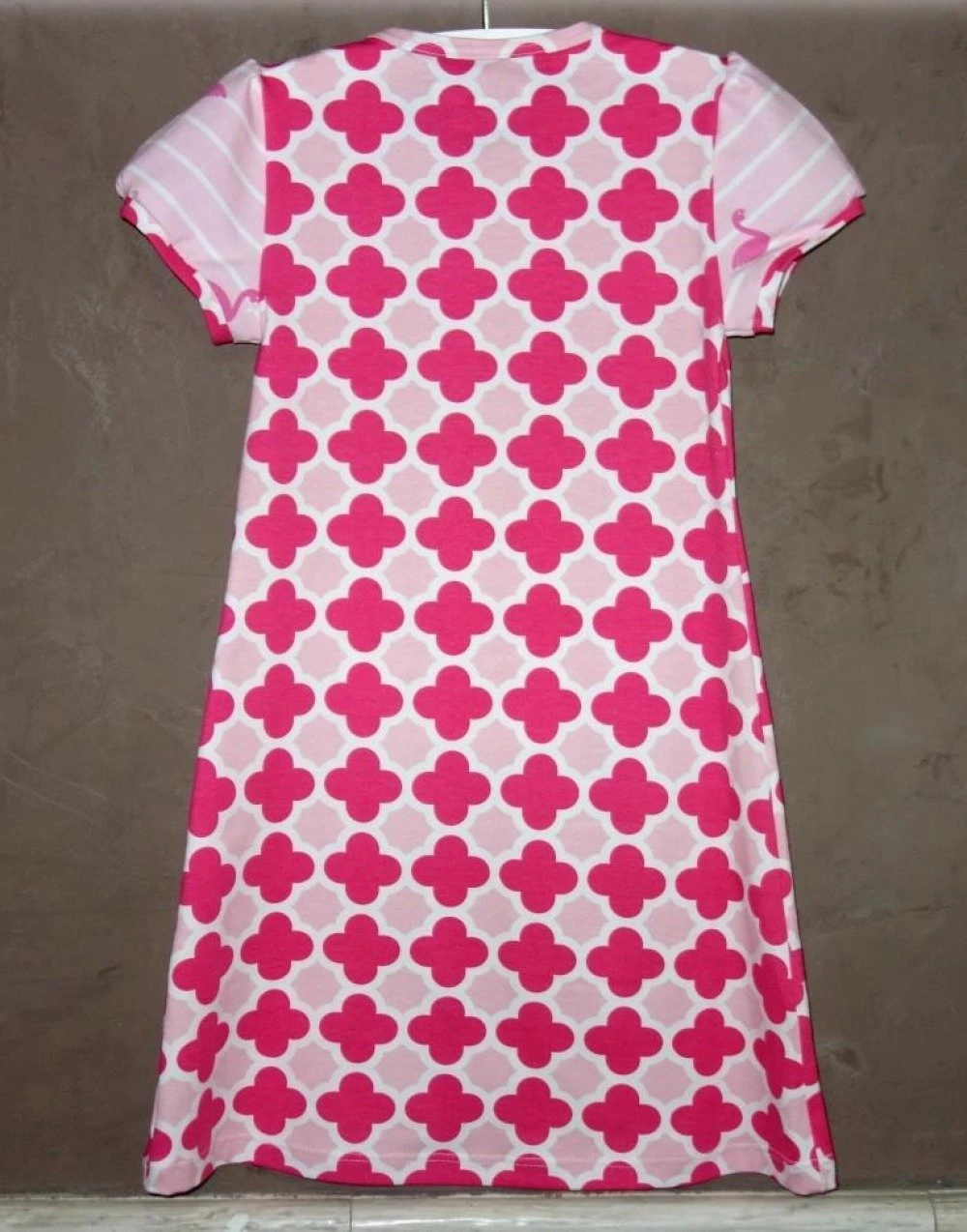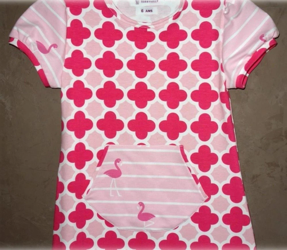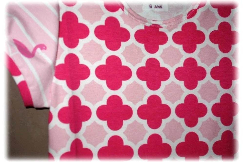 Robe droite à manches courtes entièrement confectionnée mains avec tissus en jersey de coton roses à motifs.