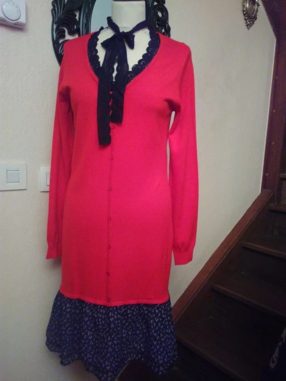 Robe manches longues en maille rouge et mousseline imprimée