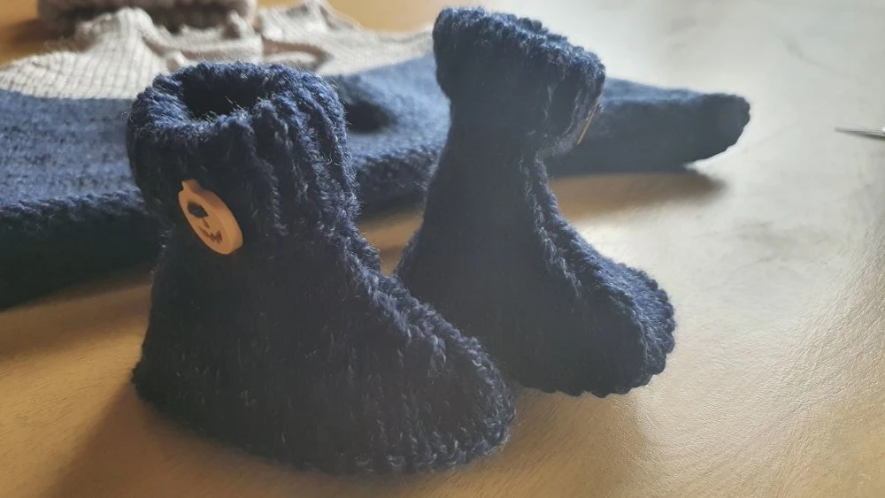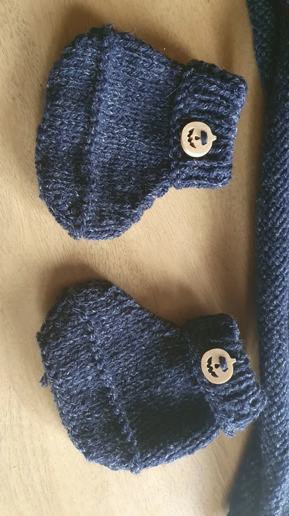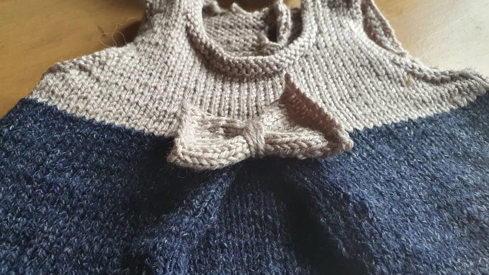 Une jolie robe en bleu chiné et beige, rehaussée d’un noeud, accompagnée de ses chaussons et de son bonnet.