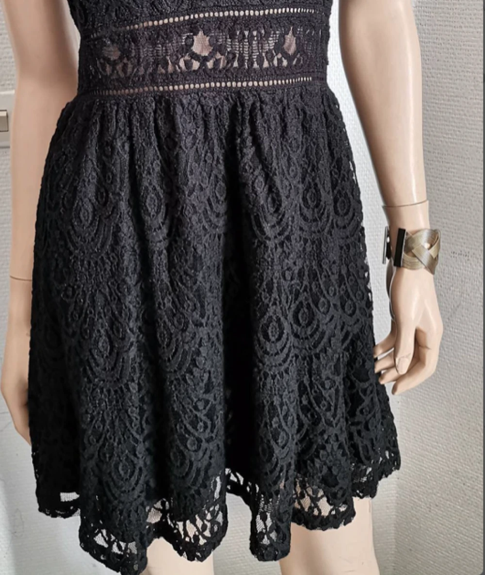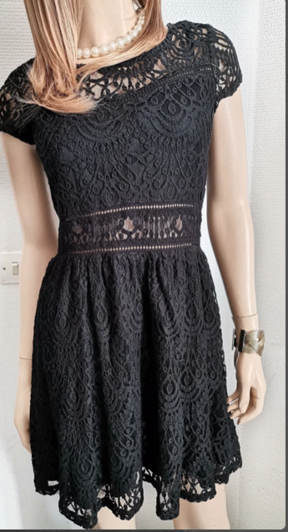 Robe courte noire dentelle a broderie avec doublure, manches courtes et transparentes encolure ronde, cintrée, fermeture dans le dos par un zip