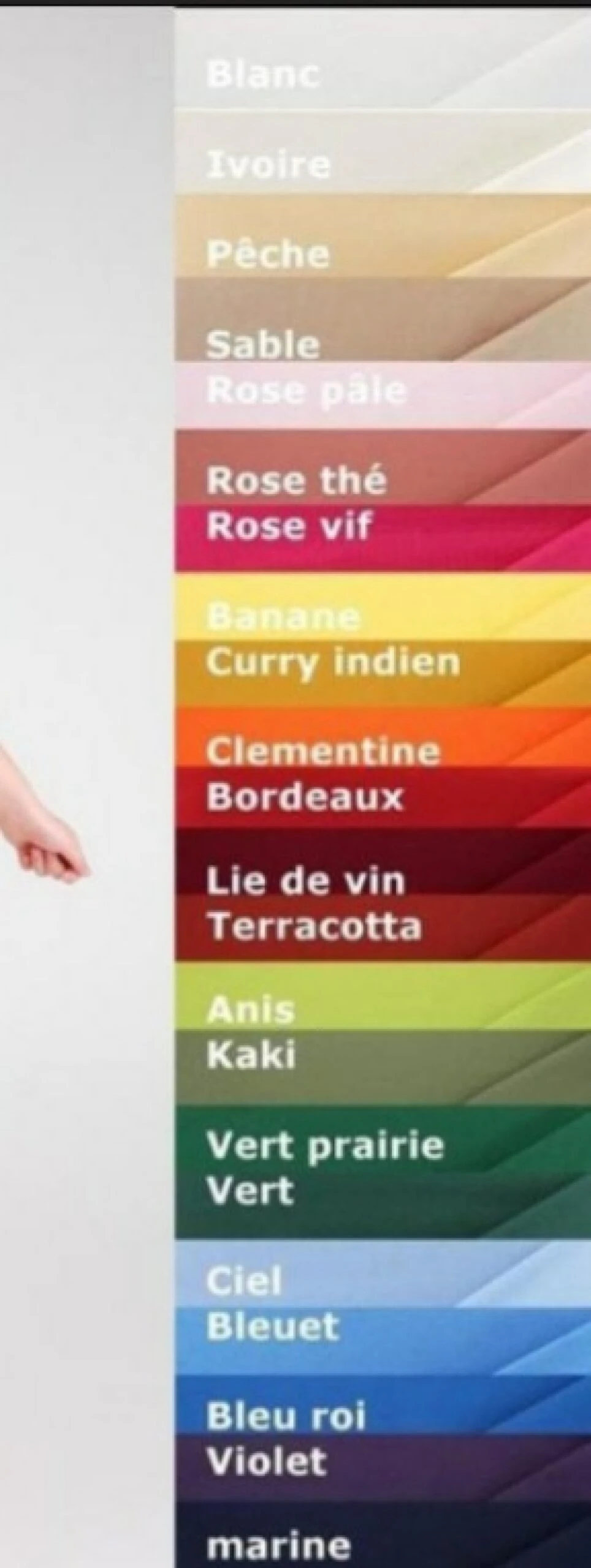 1blanc,2ivoire,3peche,4rose pale,5rose thé,6-rose fushia,7- jaune banane,8-curry,9-clementine,10-bordeaux,11-lie de vin,12-terracotta,13-anis,14-kaki,15-vert prairie,16-vert,17-ciel,18-bleuet,19-bleu roi,20- violet,21-marine