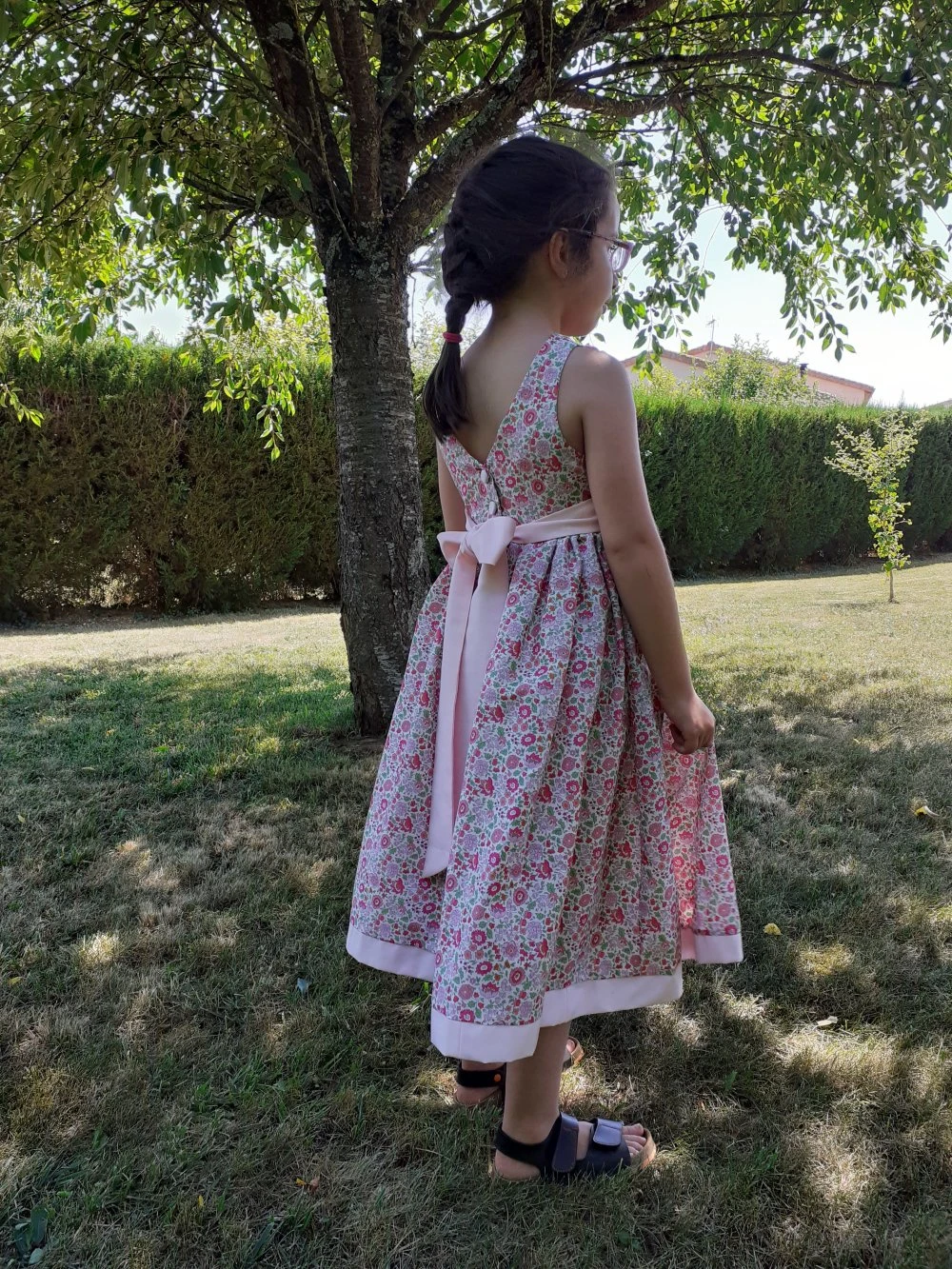 Robe de cortège enfant, avec dos nu en V. Col rond devant. Ceinture plate de différentes couleurs à nouer dans le dos ( coloris motifs liberty et uni à votre choix, elle peut être cousue dans un autre tissu à motifs ou encore uni). Ouverture dos par boutons recouverts de tissu à la main, boutonnières brodées main.