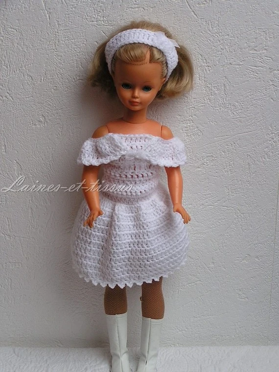 Une robe tout au crochet pour poupée Cathie de Bella fermé au dos par un bouton, bandeau assorti