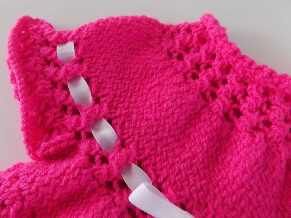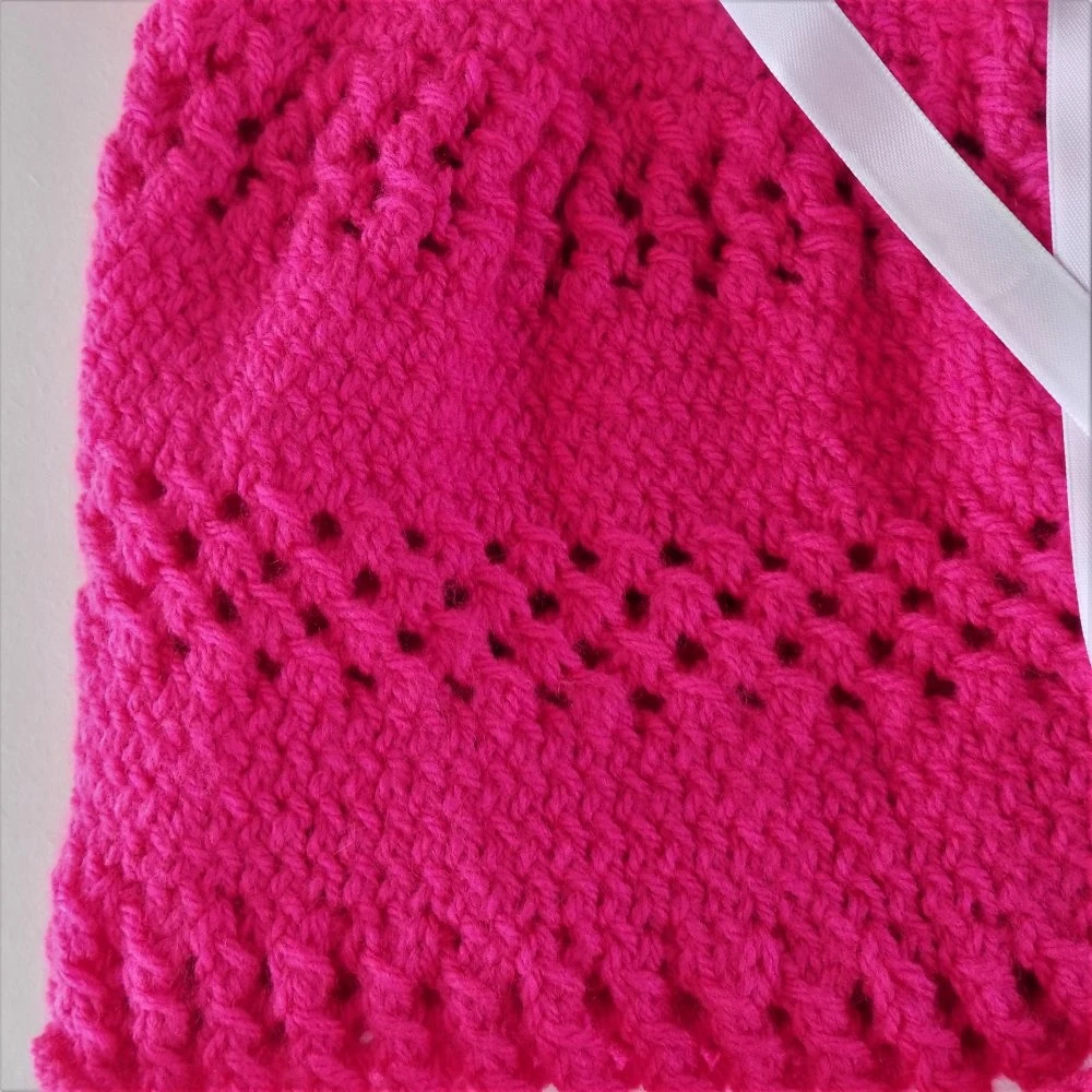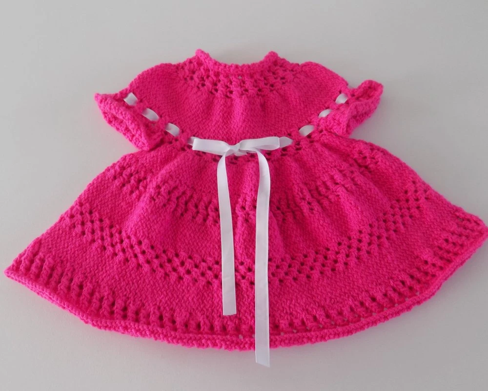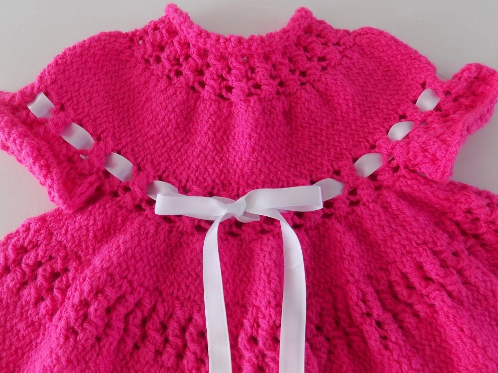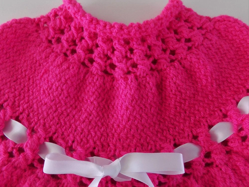 _Ravissante petite robe pour bébé réalisée à la main au tricot en laine acrylique , fil épais , de coloris rose vif en taille 3 à 6 mois , selon le poids et la taille de l’enfant , pensez à vérifier les mensurations de bébé avant de commander.