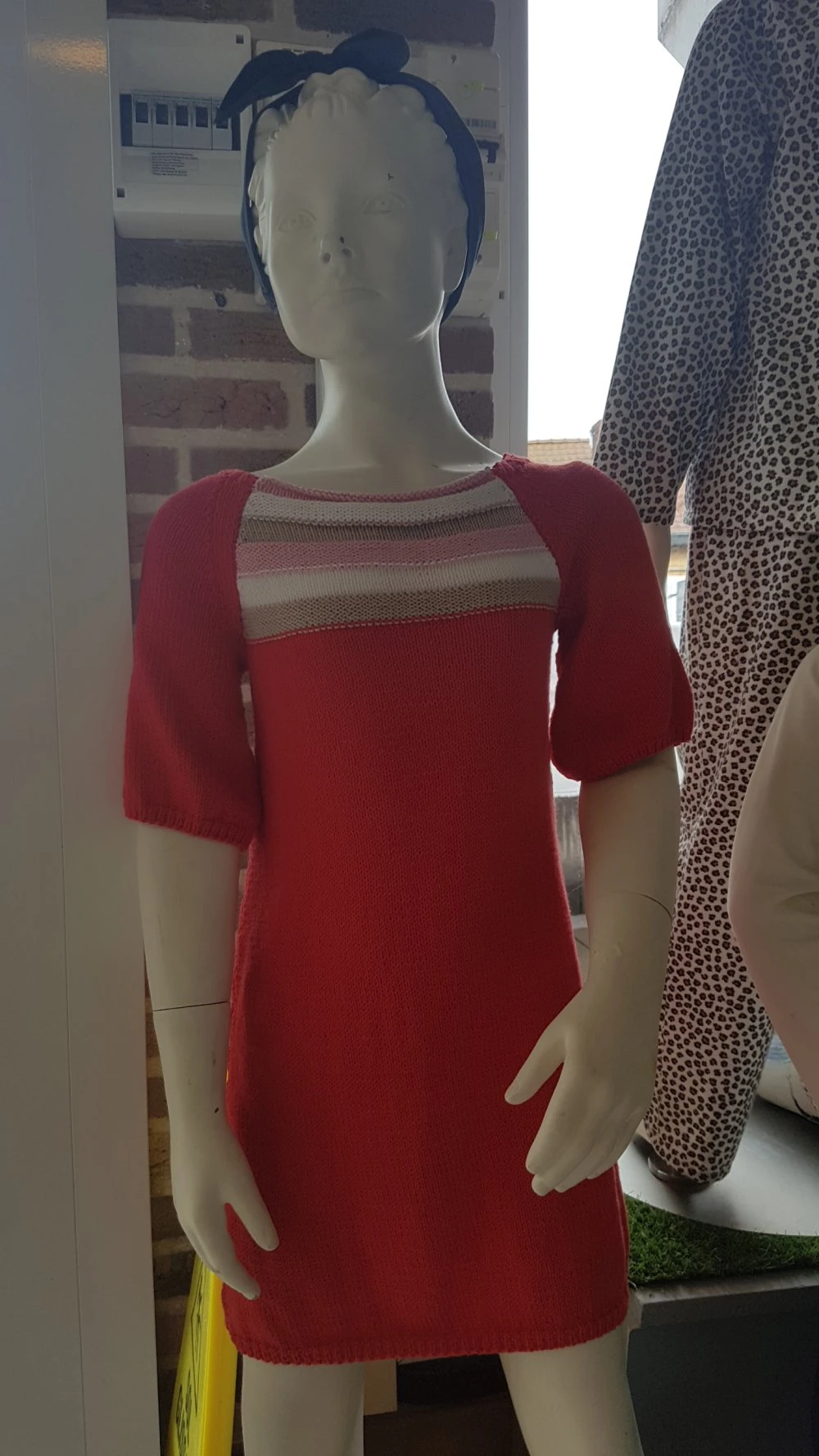 Robe pour fille, taille 4 ans, tricotée main, couleur rouge, rose, blanc et beige. Légèrement évasée en bas et aux manches, manches courtes, elle est tricotée en jersey, l’empiècement devant et dos est rayé en jersey endroit et jersey envers. Bordures de la jupe et des manches en côtes 1/1. Elle est réalisée en qualité Coton Fifty (50% coton 50% acrylique, fil fabriqué en France), coloris écarlate, ficelle, coco et berlingot, aiguilles n° 2,5 et 3.