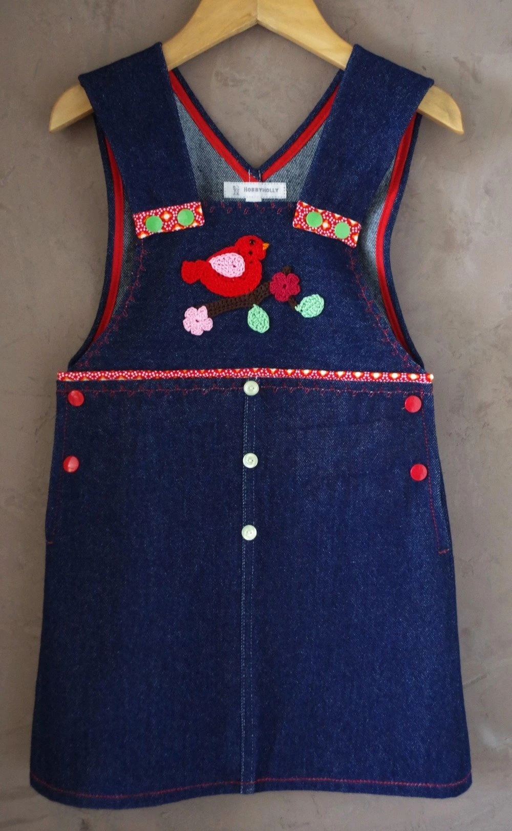 Robe salopette confectionnée mains, réalisée avec un tissu Jean de coton bleu.Elle est agrémentée d’une applique crochetée mains sur la poitrine, motif petit oiseau sur sa branche.Fermeture par boutons pressions sur les côtés et les épaules.Taille : 3 ans.