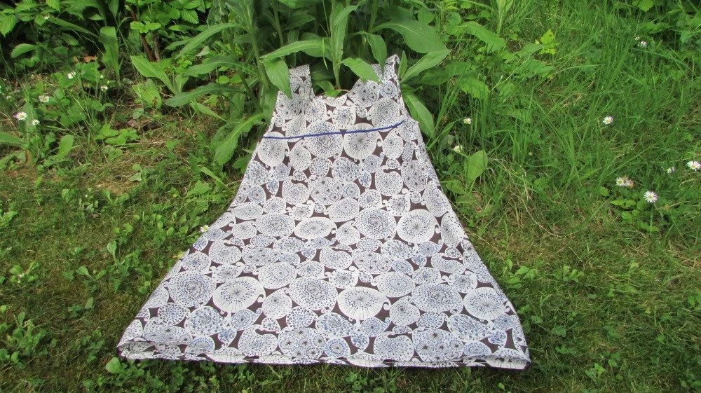 Robe d’été sans manche en tissu coton très léger style ethnique fond écru,motifs bleu et marron. Taille 3 ans. Enfilage facile, fermeture aux épaules par 2 boutons pressions. Petit liserais bleu pour souligner le devant. Lavage en machine à 40 degrés.