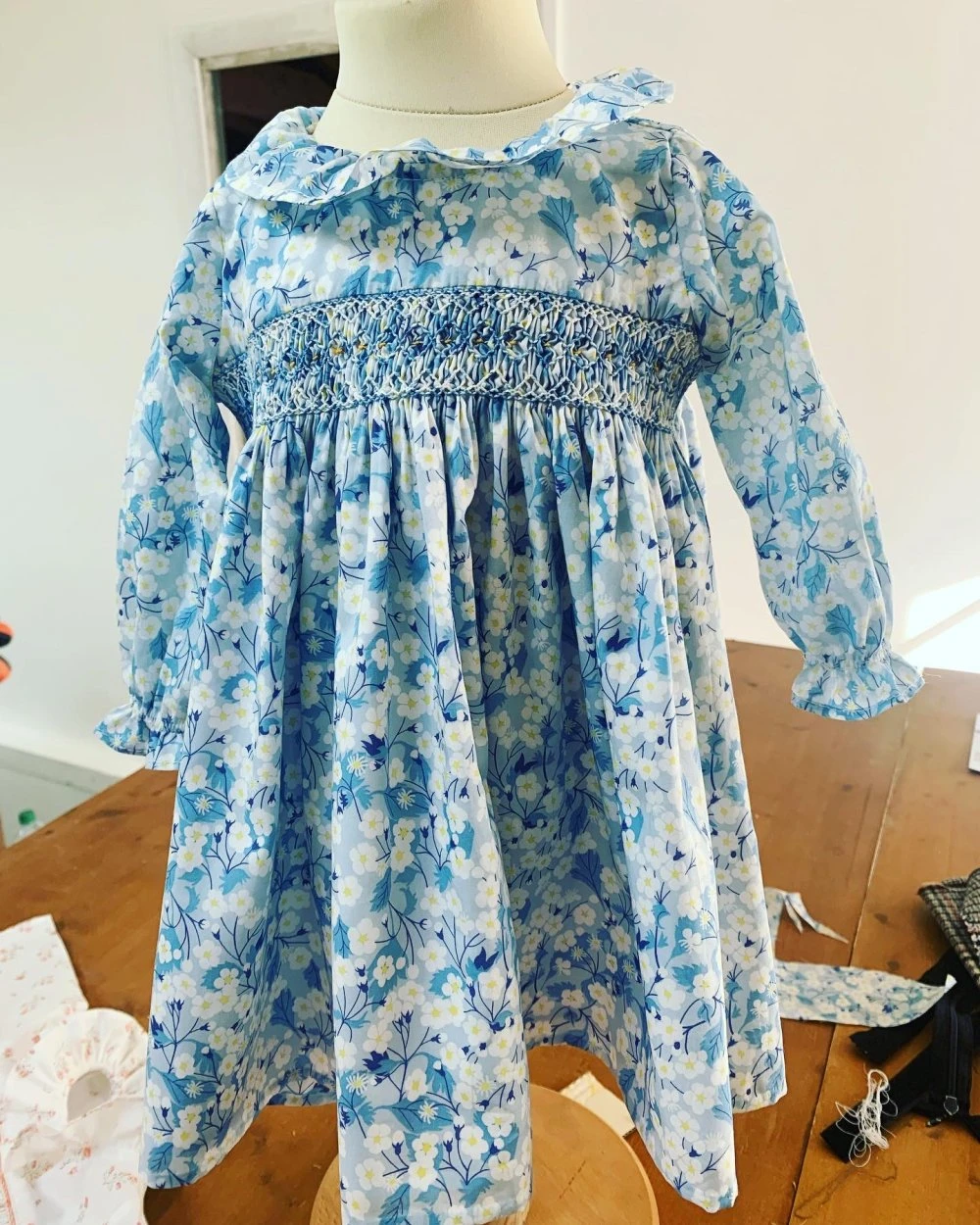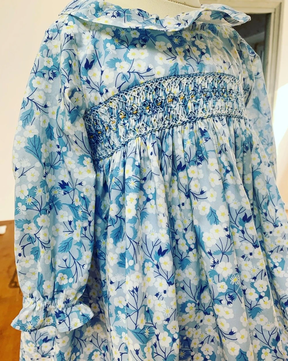 Taille 6 mois robe à smocks en Liberty bleu doublée coton. Manches longues élastiques aux poignets. Boutonnage dos. Boutons recoiverts
