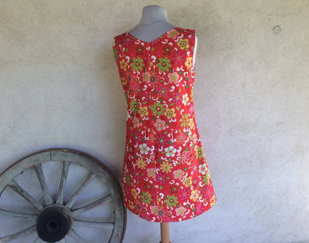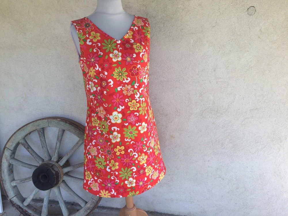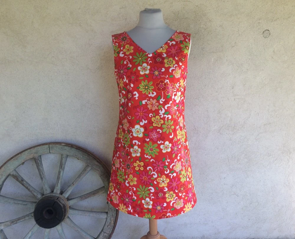 Robe trapèze ample réalisée avec un tissu coton à fleurs sur fond rouge