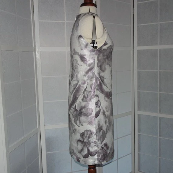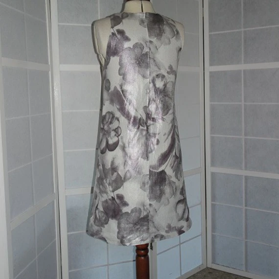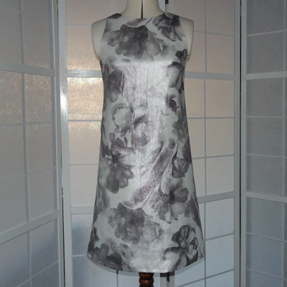 Robe trapèze ajustée réalisée avec un tissu en lin lamé blanc à fleurs grises. Le tissu donne tout son charme à cette robe qui pourrait être portée pour une occasion, une soirée ou tout simplement pour être chic au bureau. Elle pourrait se porter avec des chaussures à talon comme des chaussures plates.