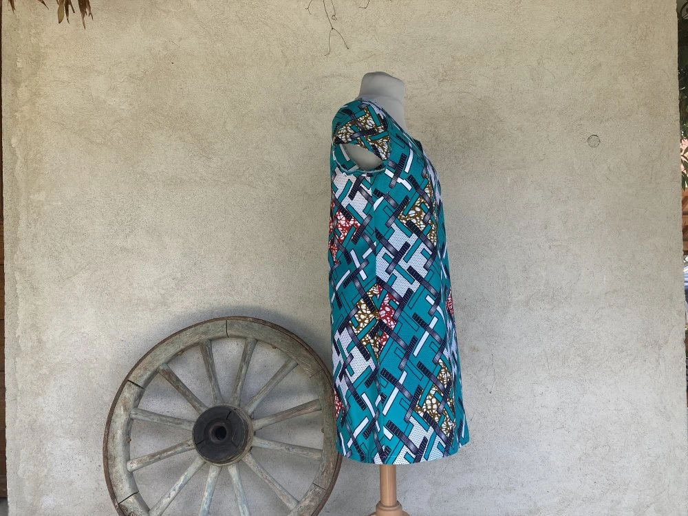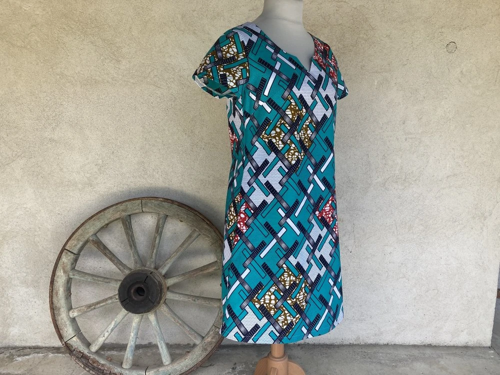 Robe trapèze ample réalisée avec un tissu en WAX 100% coton à motifs géométriques sur fond blanc et bleu.