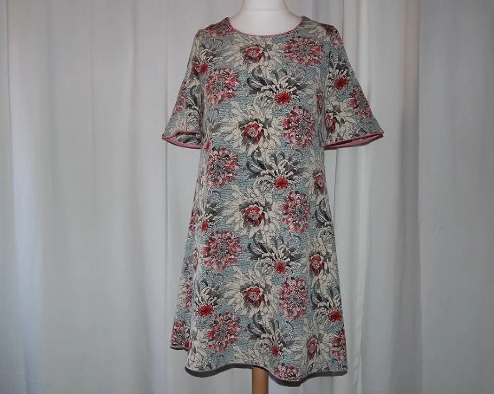 Robe trapèze à enfiler, réalisée dans un crêpe de polyester à fleurs rouges et roses sur fond beige et bleu. Cette robe est Idéale pour les beaux jours, pour une occasion comme pour être chic au bureau.
