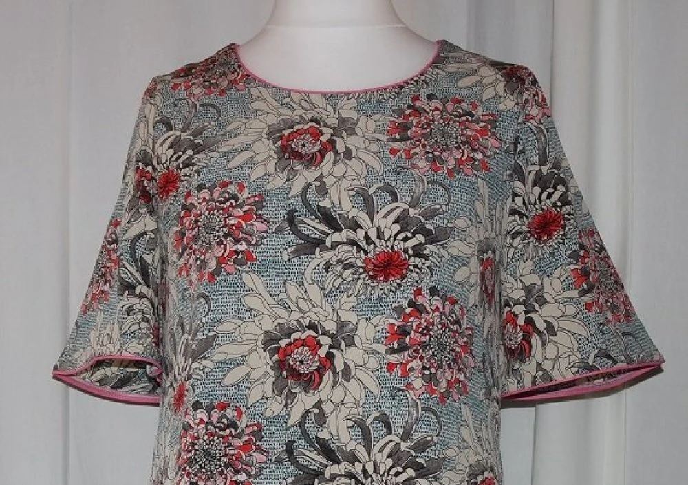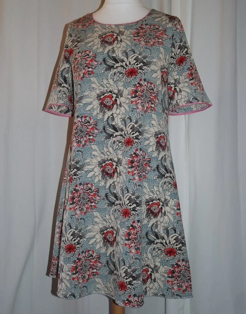 Robe encolure en ronde avec un passepoil rose. Robe doublée. Les manches sont évasées et terminées par un passepoil rose.