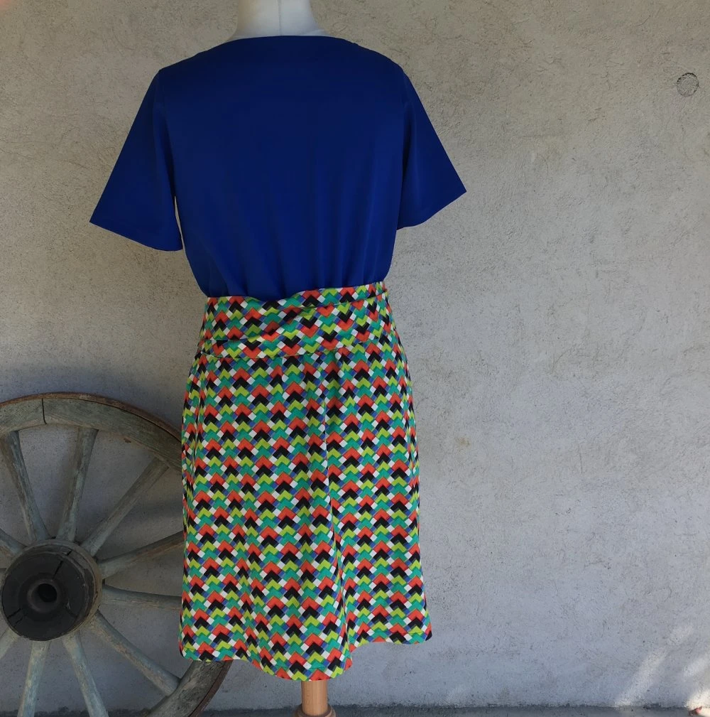 Le haut de la robe est réalisé ans un tissu crêpe bleu roi. Le bas de la robe est réalisé dans un tissu multicolore à motifs géométriques.
