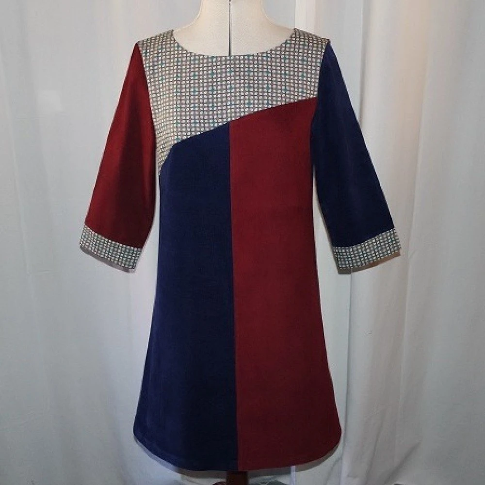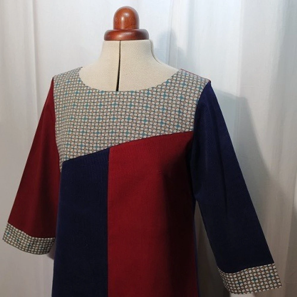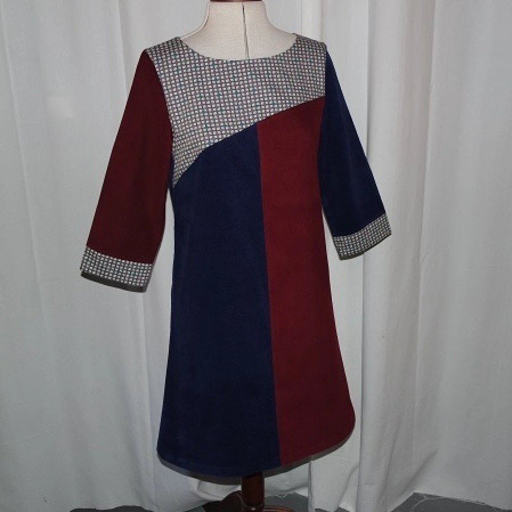 Robe trapèze ample réalisée avec trois tissus : velours milleraies marine, velours milleraies bordeaux et un tissu en coton gris à motifs bleu.