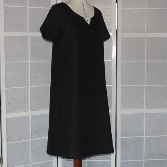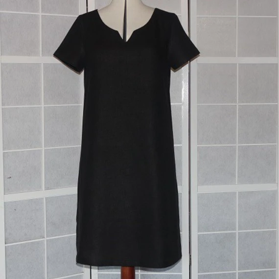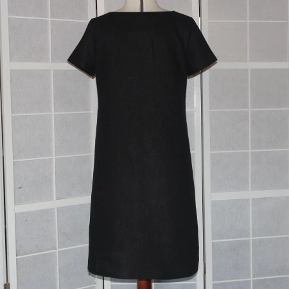 Robe trapèze réalisée avec un tissu en lin noir. Cette robe est simple avec un décolleté travaillé.