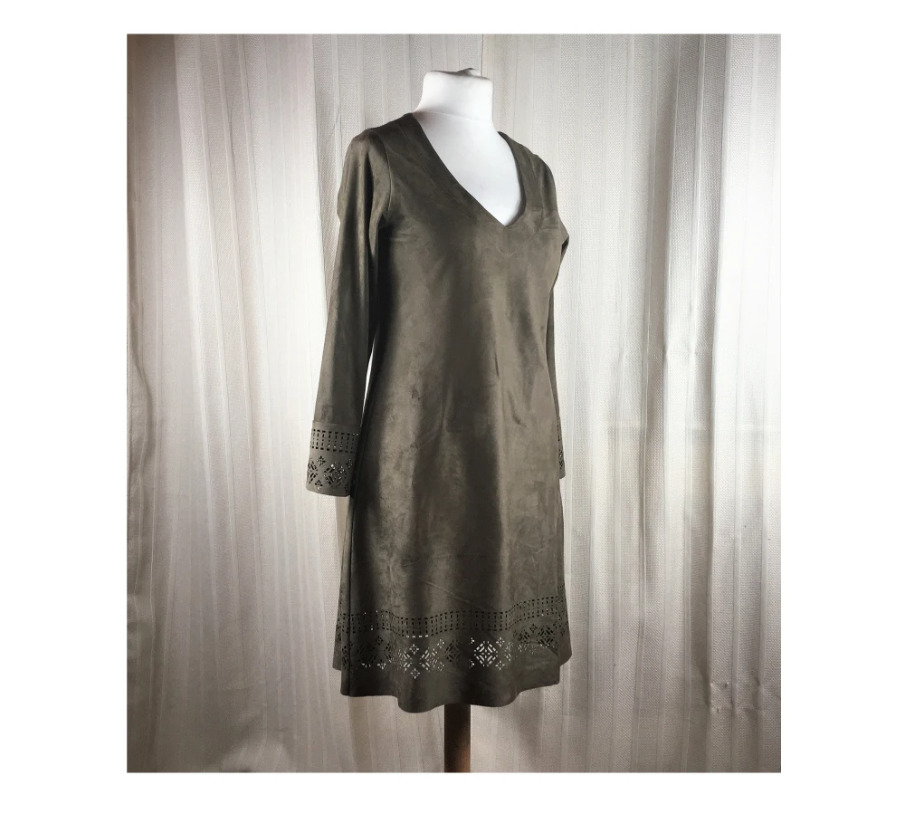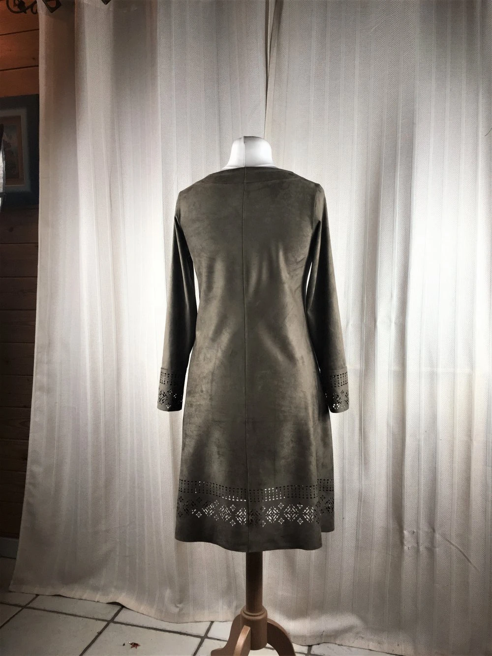 Robe trapèze ample réalisée dans une suédine (touché peau de pèche façon daim) dans les tons marron kaki avec une broderie ajourée dans le bas des manches et de la robe.
