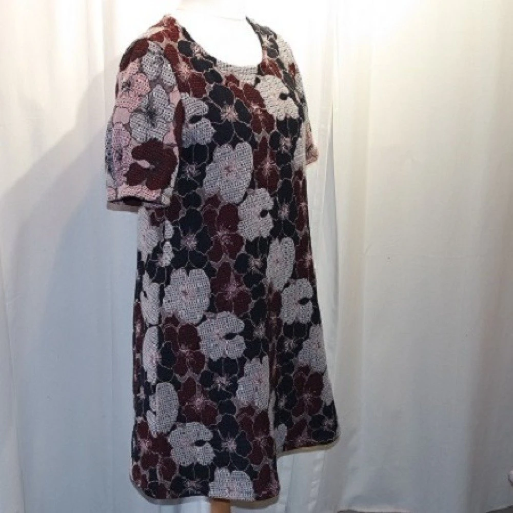 Robe trapèze réalisée avec un tissu brodé tissé en viscose. Cette robe est simple avec une encolure ronde. C’est le tissu qui donne tout son charme à la robe.