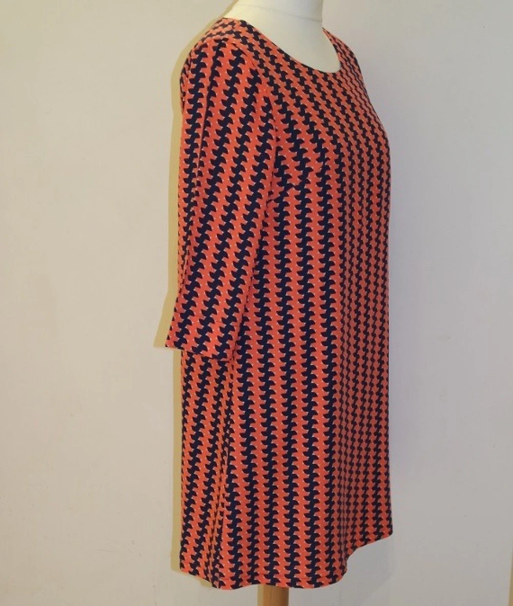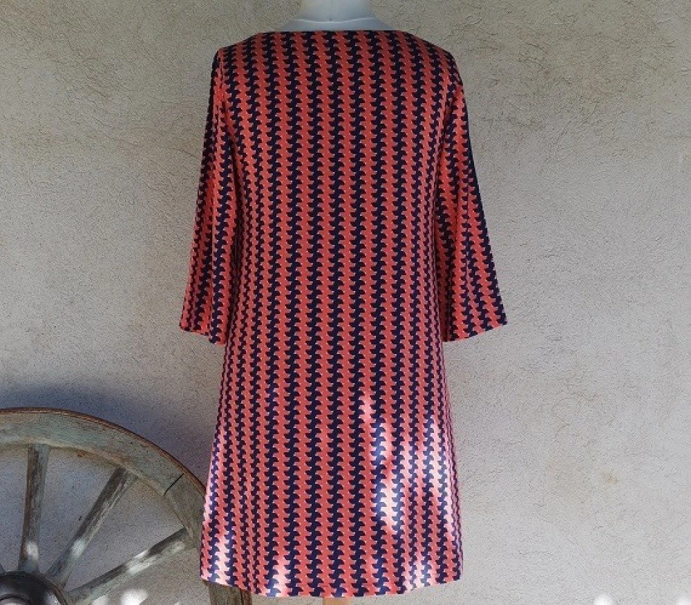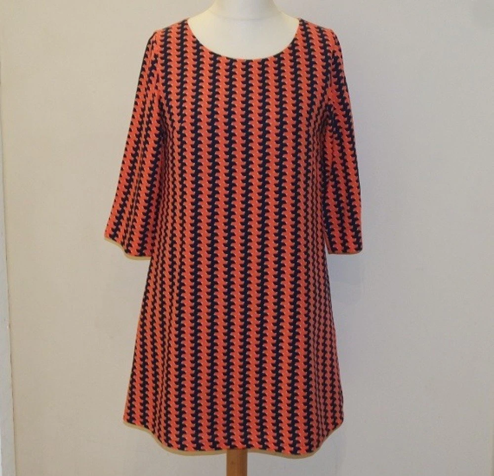 Robe trapèze courte évasée réalisée dans un tissu en crêpe de polyester à motifs géométriques bleu et orange.