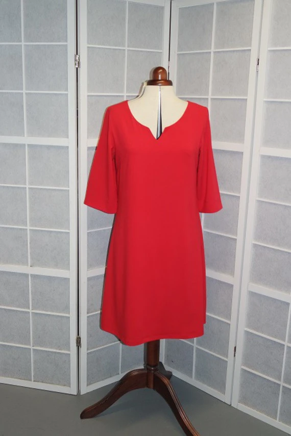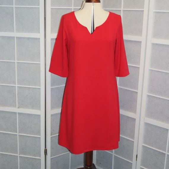 Robe trapèze ample réalisée avec un tissu un crêpe de polyester rouge. Cette robe est simple avec un décolleté avec une pointe en V.