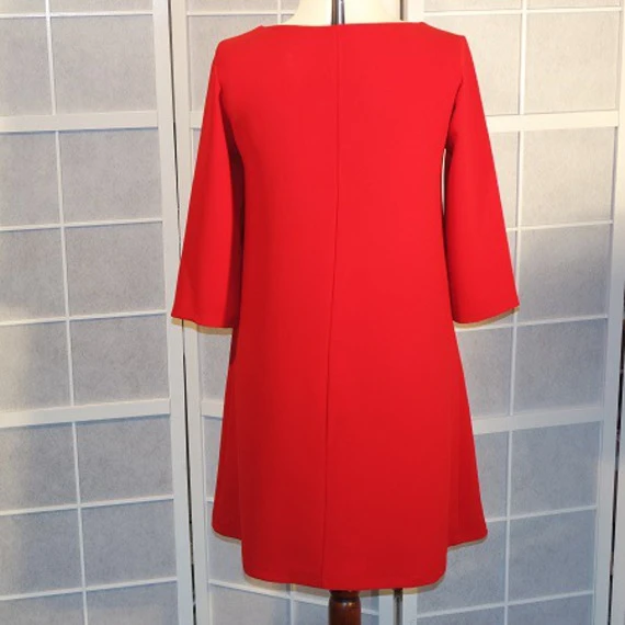 Robe trapèze ample réalisée avec un tissu un crêpe de polyester rouge. Cette robe est simple avec un joli décolleté.