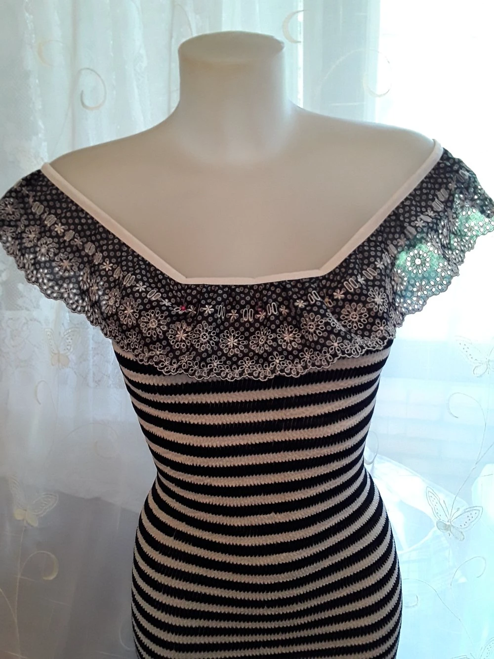 Encolure bateau et bretelles volants en dentelle broderie anglaise.