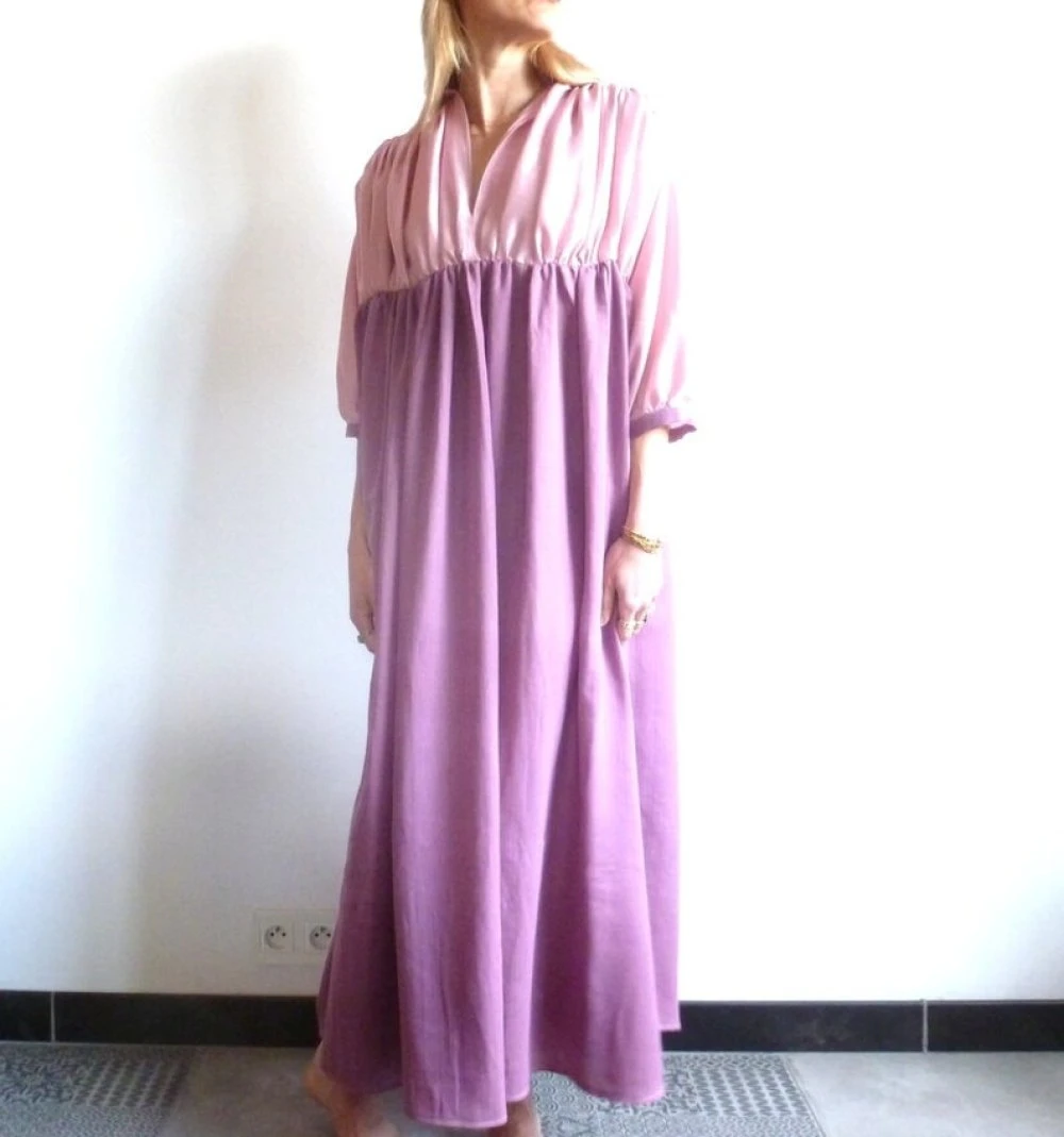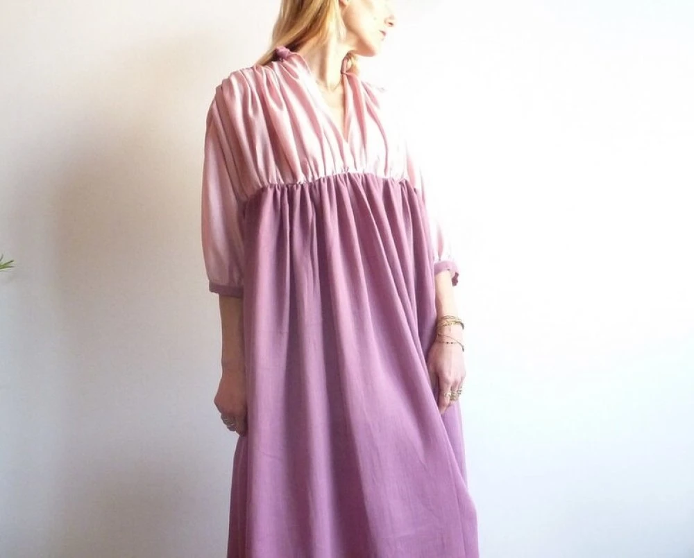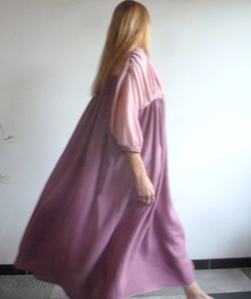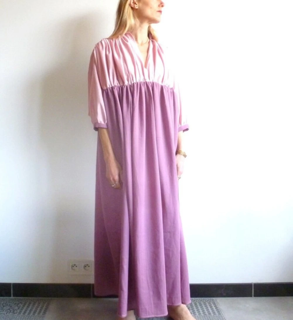 Robe longue bohème en soie rose et gaze de coton violet antique.