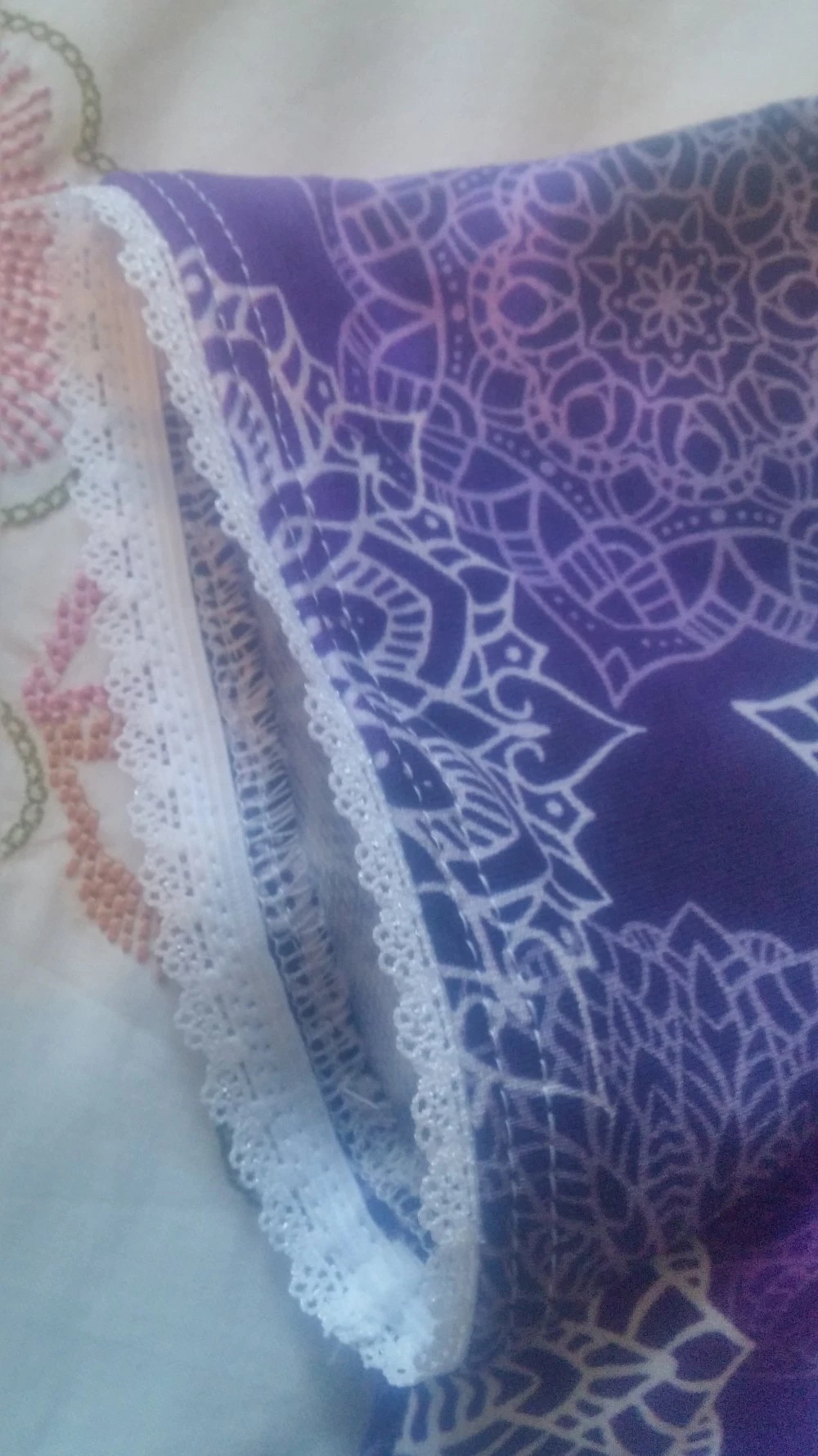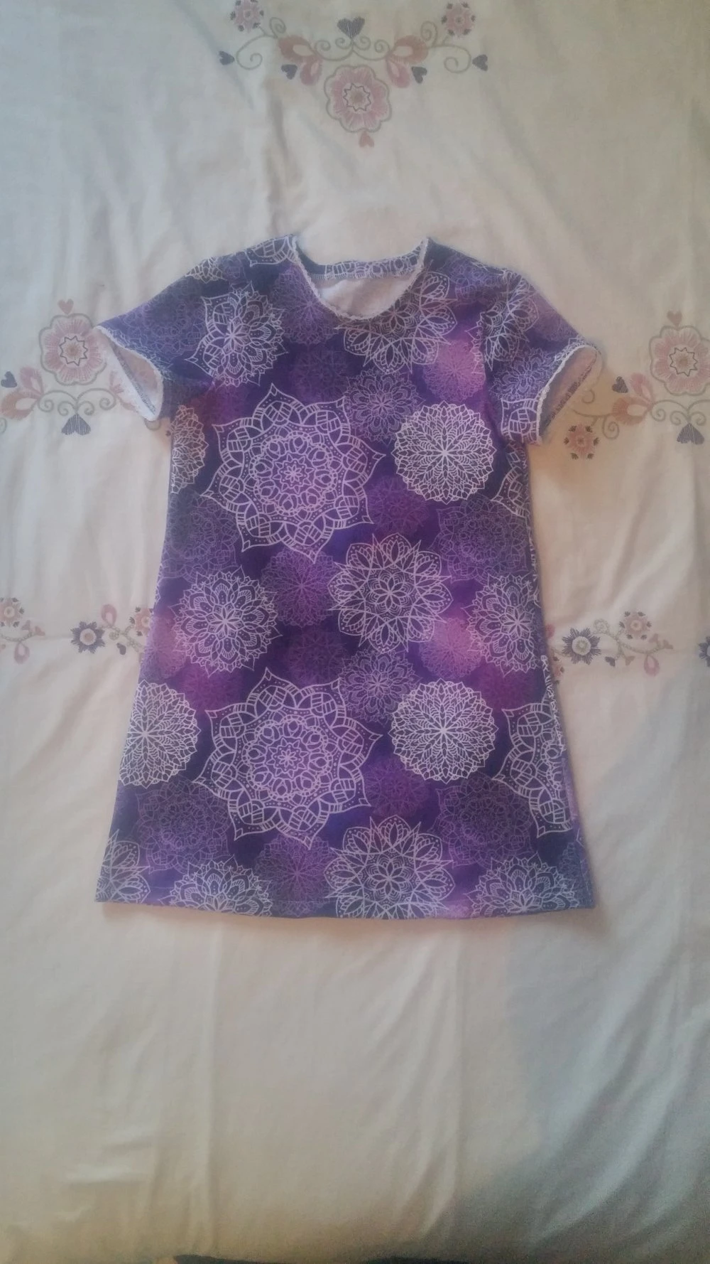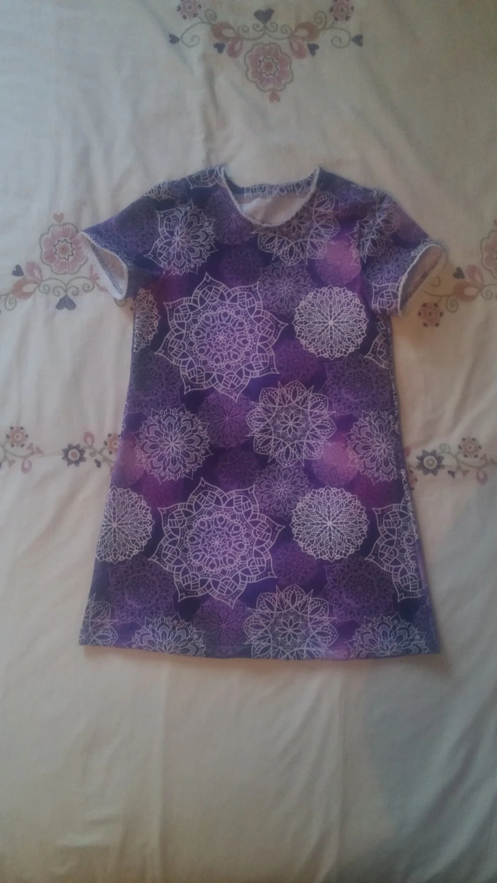 Petite robe de printemps imprimée mandalas. Finition encolure et bas manches par une dentelle élastique.