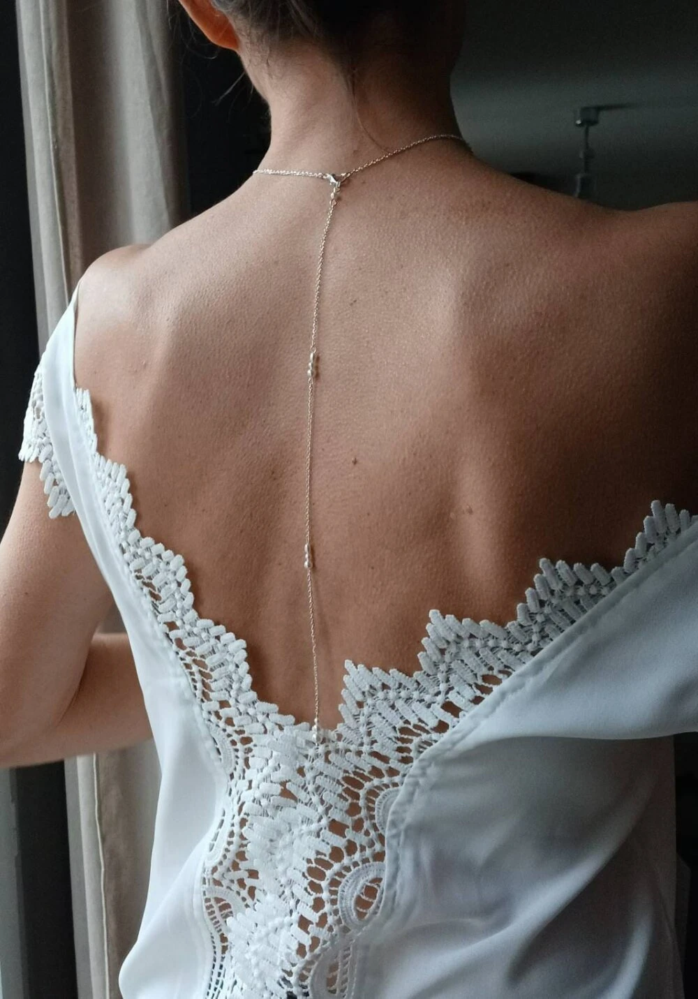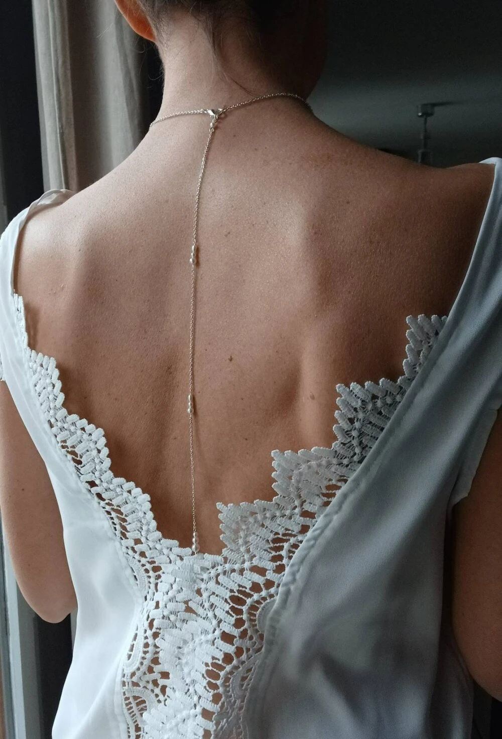 SASHA- Collier de mariée argenté pour habiller une robe dos nu- perles nacrées blanches-bijou de dos amovible- collier de cérémonie- collection 2023.