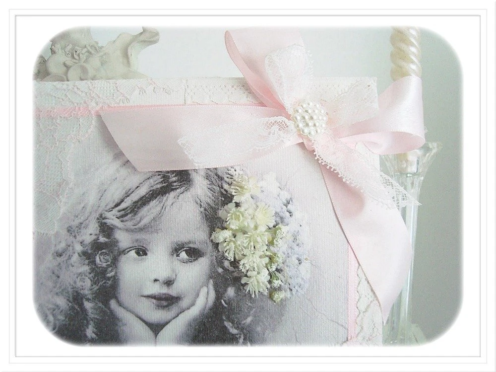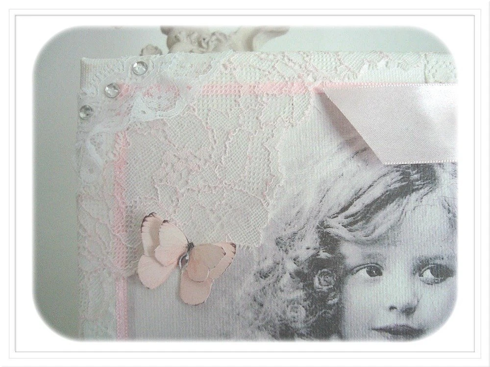 – une jolie dentelle rose pâle et blanche fleurie accompagnée d’une dentelle à l’ancienne Style Shabby avec un petit plissé rehaussés de petits strass transparents , embellissent le coins supérieur gauche et inférieur droit .