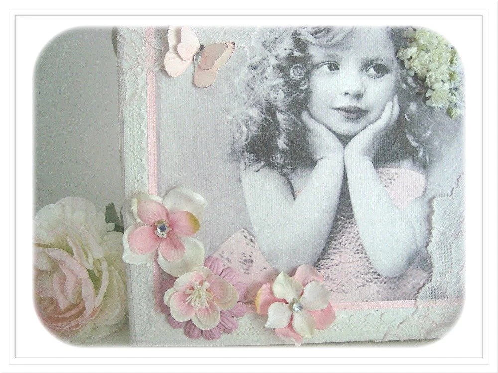 Sur le support, collage d’une serviette représentant le joli minois d’une fillette à la chevelure fleurie et à la robe rose .