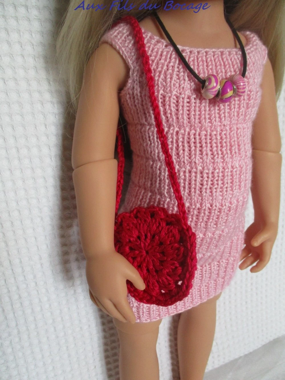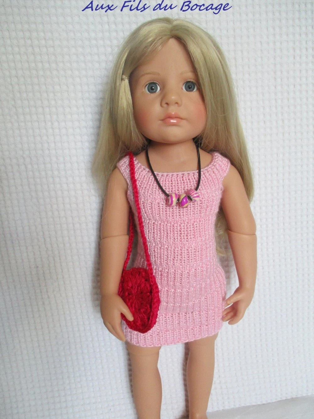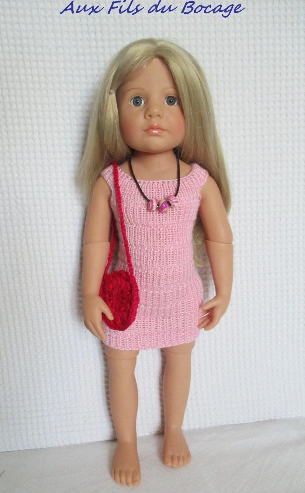 une robe réalisée au tricot avec une laine rose fermée dans le dos par trois boutons,